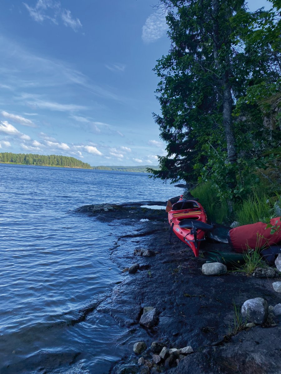 Am Ankunftstag wurde ich mit ein paar wenigen meines Busses beim Kajakverleih „Bootshaus“ in Bengtsfors raus gelassen. Die anderen und gegen meiner Größten Sorge auch die aller meisten sind danach noch zwei Stunden weiter nach Lennartsfors gefahren. Das brachte mir schon etwas Erleichterung, da ich mit deutlich mehr Gästen gerechnet habe, jedoch war diese Angst sehr unbegründet. Wir wurden von einem netten Jungen Mann des Scandtrackteams begrüßt und eingewiesen. Die Mitarbeiter des Bootshauses waren ebenfalls super freundlich und halfen wo es ging. Ich empfing meine Ausrüstung, sortierte die Sachen aus die ich nicht brauchte und konnte endlich mein Kajak in Empfang nehmen und beladen. Das war mal ne Herausforderung!! Ohne jegliche Erfahrung, außer Tretbootfahren als Kind, dass Kajak so zu beladen das man an die wichtigsten Sachen aus dem Sitz zugreifen kann und die anderen Luken so zu packen dass man nicht immer nach allem rumwühlen muss.