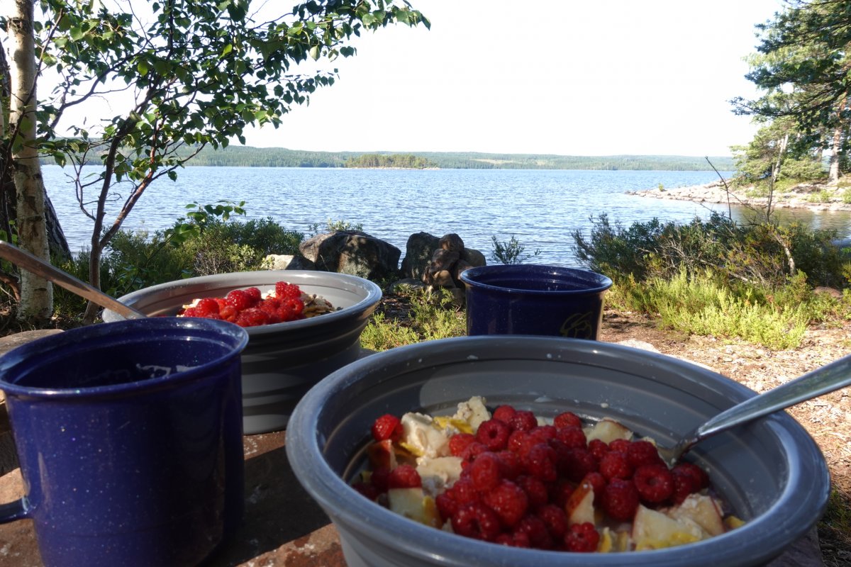 Als wir aufwachten hat es bereits geregnet. Nun waren wir froh am Vorabend unseren inneren Schweinehund besiegt und alles beiseite geräumt zu haben. Bei dem Schmuddelwetter wollten wir etwas Warmes zum Frühstück. Also gab es Porridge mit Bananenscheiben und Nutella.Den Rest vom Tag war es so windig, dass wir nicht aufs Kanu konnten und stattdessen den aktuellen Platz etwas optimiert haben. Mit dem Tarp haben wir uns einen Windschutz gebaut und direkt dahinter aus Steinen zwei Sitze und einen Tisch gebaut. Danach sind wir noch Beeren fürs Frühstück sammeln gegangen (wenn ihr weiter in den Wald lauft, findet ihr auch Himbeerbüsche).