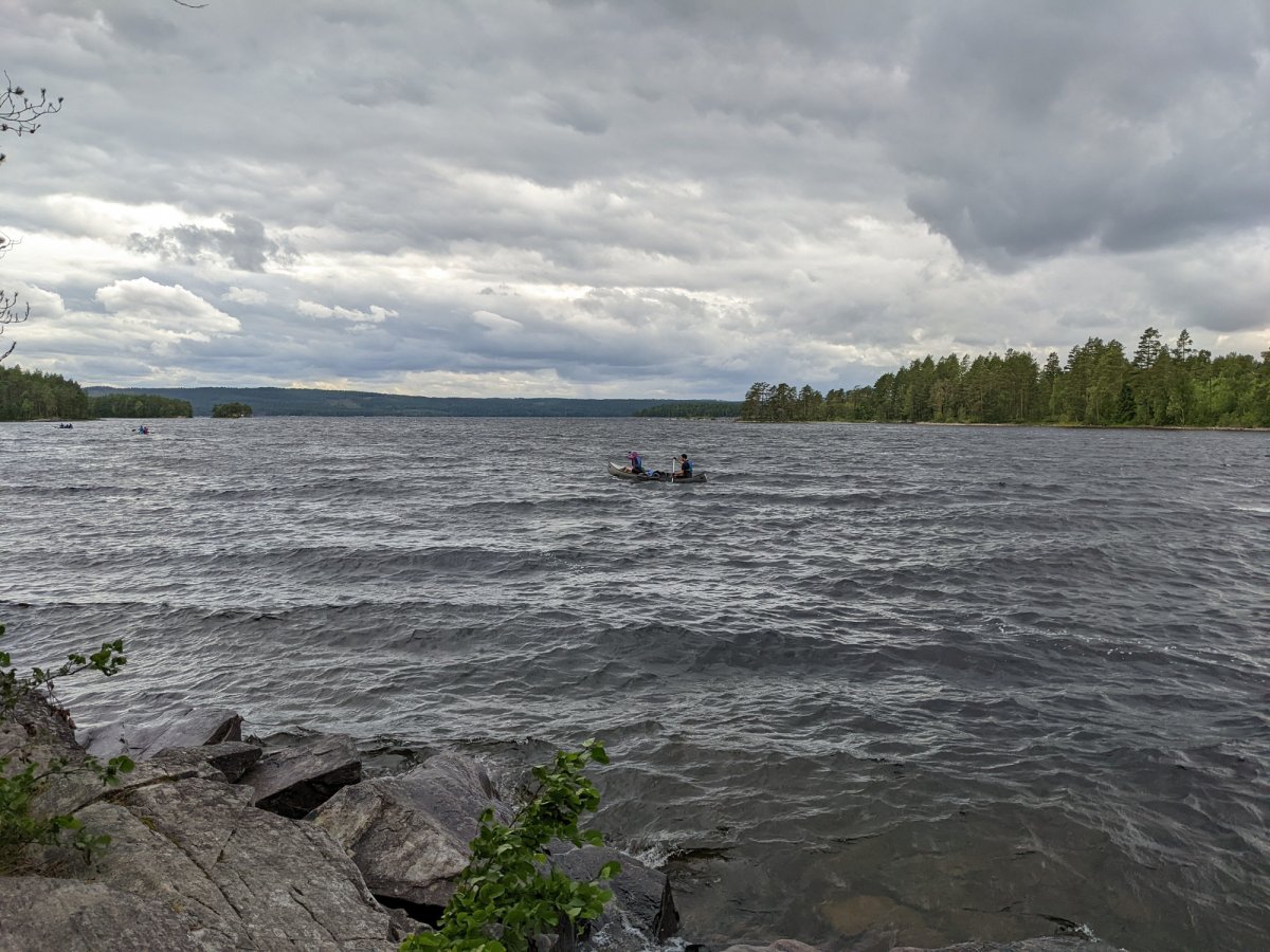 Nachdem es die Nacht durchgeregnet hatte, ging es mit Regen am Vormittag weiter. Der Wind blies inlandig aus Süd-West in die kleine Bucht von Knappstadviken und auf den Wellen bildeten sich kleine Schaumkronen. Während wir auf besseres Wetter warteten, machten wir einen kleinen Spaziergang an Land. Ab Mittag ließ der Regen nach und wir konnten aufbrechen Richtung Norden, entlang der Ostküste des Stora Gla zum Lagerplatz 14, am Erstaviken. Als wir dort ankamen, waren alle, die die Nacht dort verbracht hatten, im Aufbruch. Wir hatten also wieder den Rastplatz diese Nacht für uns allein, was erstaunlich war, denn die Nacht zuvor hatten dort 16 Kanuten campiert! Nachdem wir den Ablegenden beim Beladen der Boote geholfen hatten (dies war an diesem Tag eine Herausforderung, da der Wind stetig in die Bucht blies und die Kanus gegen die steilen Felsen schlug), bauten wir unser Lager auf.