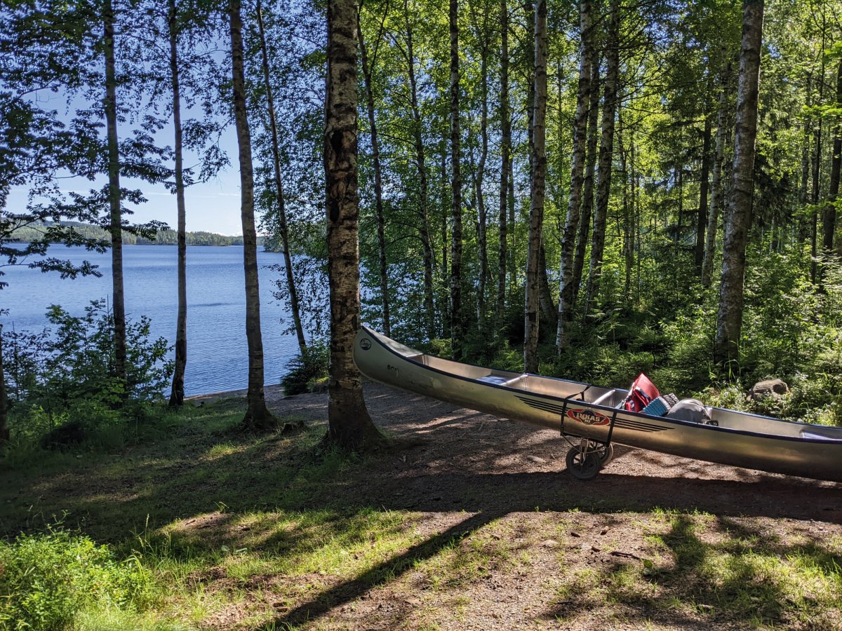 Am Morgen war es noch windig, und für mich war es wieder eine Mutprobe, die Bucht von Glava Glasbruk zu durchqueren. Wegen des Wellenganges hatten wir uns vorgenommen, nur die Bucht zu überqueren und unser Lager an der Schutzhütte 16 aufzubauen. Doch die Suche nach Platz 16 wurde zur Odyssee. Zuerst versuchten wir den Platz durch die Bucht Stockviken zu erreichen. Der Wind trieb die Wellen genau in die schmale Bucht und wir wurden abenteuerlich mit dem Wind im Rücken mitgetragen. Der Wasserweg, der auf der Karte eingezeichnet war, war allerdings komplett zugewachsen, also beschloss ich, an Land zu gehen und zu schauen, ob man eventuell den Platz zu Fuß erreichen kann, während Christian im Boot auf mich wartete. Das Gelände war unübersichtlich und im Unterholz fand ich den auf der Karte eingezeichneten Weg zum Lagerplatz nicht. Als ich zum Boot zurückkehrte, stellte ich mit Entsetzen fest, dass ich unsere Karte im Unterholz verloren hatte. Wir machten das Boot an Land fest und mussten nun beide im Unterholz nach der verlorenen Karte suchen. Ich versuchte meinen Weg durch das Gebüsch zu rekonstruieren, so gut es ging. Panik stieg in mir auf. Woher sollten wir eine neue Karte bekommen? Auf die Handys war auch nicht zu einhundert Prozent verlass, da auf Maps die Rastplätze nicht eingezeichnet waren. Christian war in seinen leichten Laufschuhen unterwegs und zog sich noch eine Schürfwunde am Knöchel zu. Und dann plötzlich sah er die Karte. Wir waren gerettet und wurschtelten uns durchs Unterholz zurück zum Kanu. Nach dem Ausflug ans Land hatte der Wind nachgelassen. Auf der Suche nach einem Nachtlagerplatz fuhren wir um die Inseln Halvarsnäs und Märrholmen herum. Diese waren jedoch komplett zugewachsen mit Heidelbeersträuchern und so nutzten wir das gute Wetter am Nachmittag und überquerten den Stora Gla von Ost nach West mit dem Scandtrack Basislager Trångstadviken als Ziel. Am Nachmittag besuchten wir das Café Carl und gönnten uns je ein Wienerbröd (schwedisches Gebäck), Kaffee und Tee. Abends gingen wir noch zum Campingplatz von Lenungshammar um zu duschen. Das war ein schöner Abschluss des Tages.