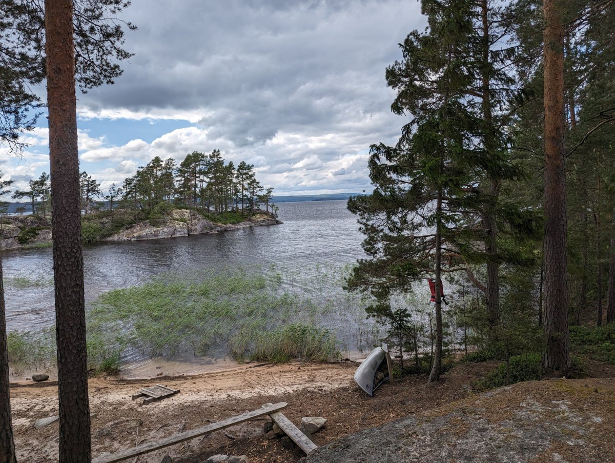Der fünfte Tag und somit Halbzeit. Wie schnell die Tage bisher verflogen sind. Auch am fünften Tag erwartete uns keine Langeweile, im Gegenteil! Tag 5 brachte Wind. Viel Wind! Wir hatten uns angewöhnt, mindestens zweimal täglich die Wettervorhersage zu prüfen und wussten, dass die perfekten Sommertage erstmal etwas rauem Wetter Platz machen würden. Von Scandtrack per SMS vorgewarnt, unsere Route mit Bedacht zu planen, studierten wir am Morgen nochmal unseren Plan und machten uns auf den Weg. Das war ein anderes Fahrerlebnis als die letzten sonnigen Tage. Das Paddeln war anstrengender und die Wellen wurden höher. Angedacht war nach Osten zu fahren und in einem Flussarm vor dem kommenden Sturm Schutz zu suchen, aber die Wellen machten unser Vorankommen auf dem Wasser irgendwann fast unmöglich. Wir entschieden uns, auf Nummer sicher zu gehen, und haben mit DANO14 zum ersten Mal einen offiziellen Platz angefahren, damit wir dort unser zusätzlich erworbenes Feuerholz zum Wärmen nutzen können. Die Windböen mit 70 km/h am Nachmittag waren dann aber doch nochmal heftiger als wir es uns vorgestellt haben. Einen Großteil der Kraft an diesem Tag haben wir dafür aufgewendet, den Windschutz für unseren Lagerplatz zu verbessern, Holz zu hacken und die Wasserreserven (Wasserfilter!) aufzufüllen. Öl, das wir beim Kochen verwendeten, flog durch den Wind einfach zur Seite weg und erreichte nicht einmal mehr die Pfanne. Nachdem am Abend der Hunger und Durst gestillt und das Lager wetterfest gebaut war, fühlten wir uns, als hätten wir einen epischen Kampf mit der Natur gewonnen. Die Wärmflasche wurde in der Nacht unser bester Freund.