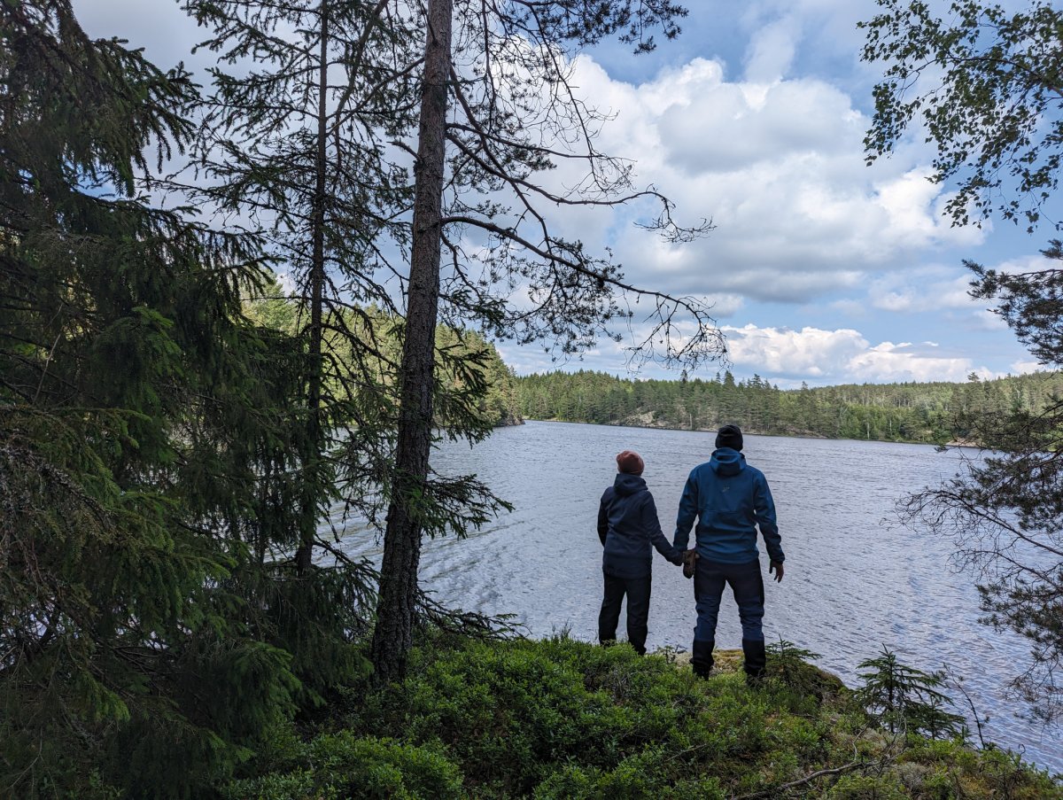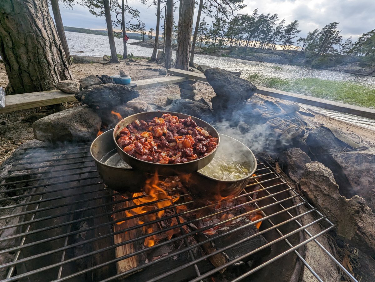 Das Abenteuer begann Anfang Juni nicht auf dem Wasser, sondern im Bus. Eine gemütliche 24-Stunden-Fahrt von Köln nach Schweden. Über Hamburg, Hannover und mit zwei Fährüberfahrten landeten wir in Lennartsfors. Unsere erste Erkenntnis: Auch der skandinavische Sommer ist nicht frei von Regen. Aber hey, es ist unsere Hochzeitsreise – da lassen wir uns von ein bisschen Regen doch nicht die Laune verderben! Nach der Ankunft ging es mit geballter Muskelkraft über Wiesen und Pfade zum Ausrüstungsverleih. Hier wurden wir vom Scandtrack-Team herzlich empfangen und mit einer Flasche Sekt und Scandtrack-Bechern zur Hochzeitsreise beschenkt, worüber wir uns sehr gefreut hatten. Vielen Dank nochmal! Wir packten unsere und die erhaltene Ausrüstung in wasserdichte Säcke und schon ging es los zu unserem Gefährt für die nächsten Tage, unserem Kanu. Nach ein paar Paddelschlägen kam auch wieder die Sonne raus und wir wussten: Das wird legendär. Wir machten Kurs zu unserem ersten Spot und bauten unser Lager für die Nacht auf. Der Aufbau unseres ersten Shelters klappte besser als gedacht. Die Aussicht von “unserem” kleinen Hügel war magisch. Hier befand sich leider direkt eine wilde Feuerstelle, die wir aufgrund der geltenden Regelung aber nicht nutzten. Nach getaner Arbeit gab es dann noch ein köstliches Abendessen bei Sonnenuntergang, die Tonne mit der Verpflegung bietet hier genug Auswahl für jeden.
