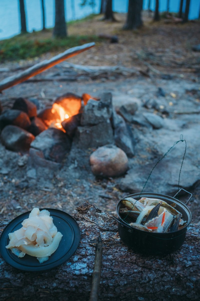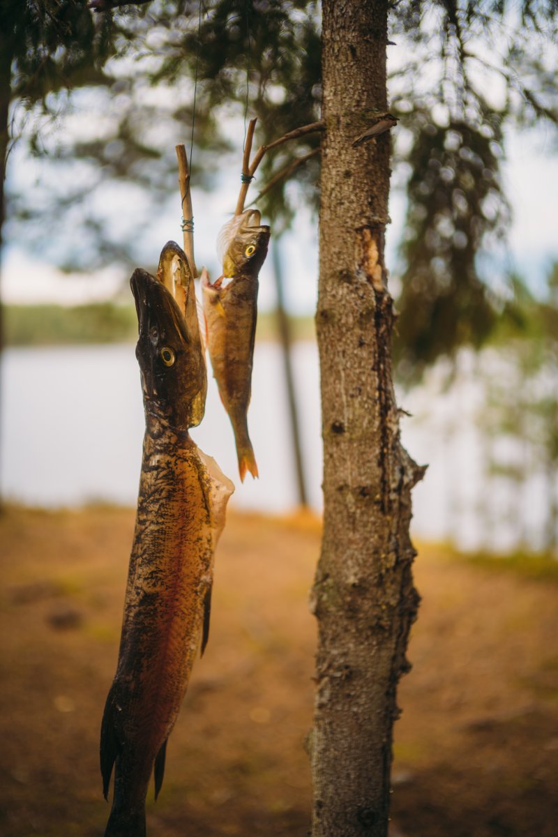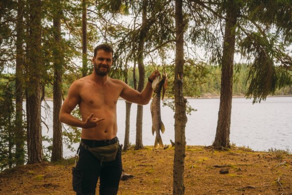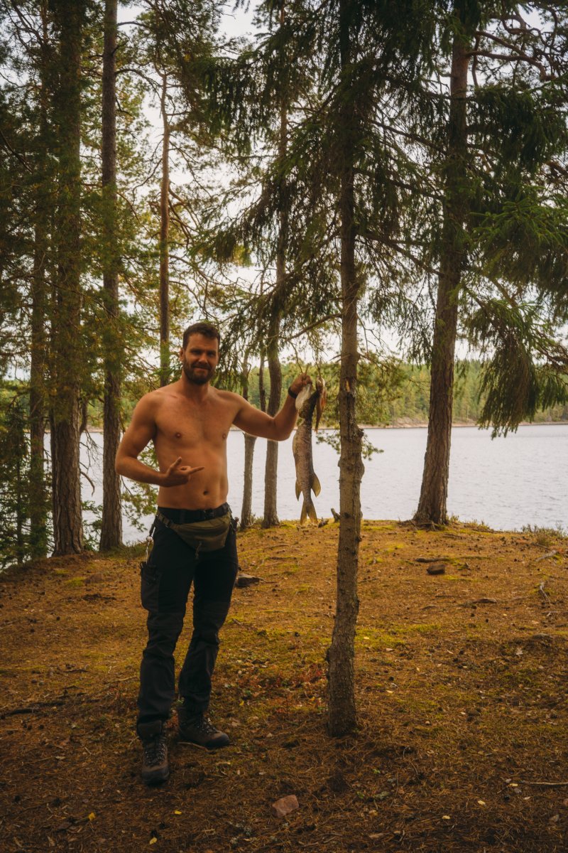 Thore, der andere mit Angelkarte, schloss sich mir an, während Michael indes die bereits vorhandene Feuerstelle aufbereitete, die augenscheinlich schon von vielen anderen Gruppen genutzt, aber aufgrund der vielen lose aufeinander gestapelten Steine individuell umgebaut werden konnte. Nach knapp zwei Stunden erfolglosen Abklapperns von Schilf- und Seerosengebieten mit dem Kanu und dem ständigen Wechsel der Köder von Gummifisch auf Blinker/Spinner und zurück machte ich meinen ersten Fang dieser Reise: einen stolzen, ca. 60 cm großen Hecht (messen konnten wir ihn nicht, da wir kein Maßband dabei hatten). Thore holte ihn mit dem Kescher ein und erlöste ihn unmittelbar und waidgerecht von seinem Kampf. Dieser Moment war für mich in zweierlei Hinsicht bedeutend: Zum einen hatte ich die Erkenntnis "Ja, hier kann man Fische fangen und die Woche überstehen", zum anderen war es der erste Fisch, den ich seit 25 Jahren geangelt habe (ich bin 39). "Okay, es klappt noch, es ist tatsächlich Muscle Memory. Vertraue darauf." Thore zog noch einen mittelgroßen Barsch heraus, und wir fuhren mit anbrechender Dunkelheit zurück in unser Lager, wo wir bereits mit dem ersten Feuer in Empfang genommen wurden. Wir nahmen die beiden Fische aus, entschuppten und filetierten sie, und aus ihren Resten kochten wir eine köstliche Fischsuppe. Alle drei wurden satt und wir gingen, so wie von nun an jeden Abend, um kurz nach Mitternacht ins Bett.