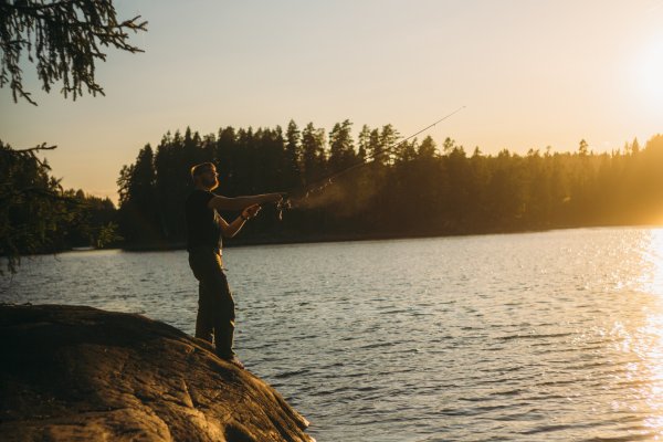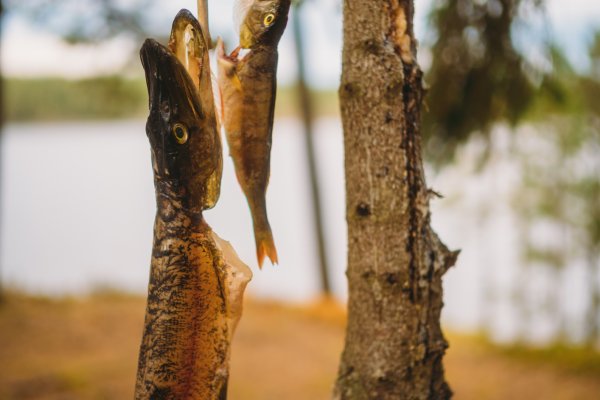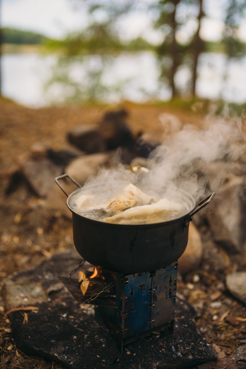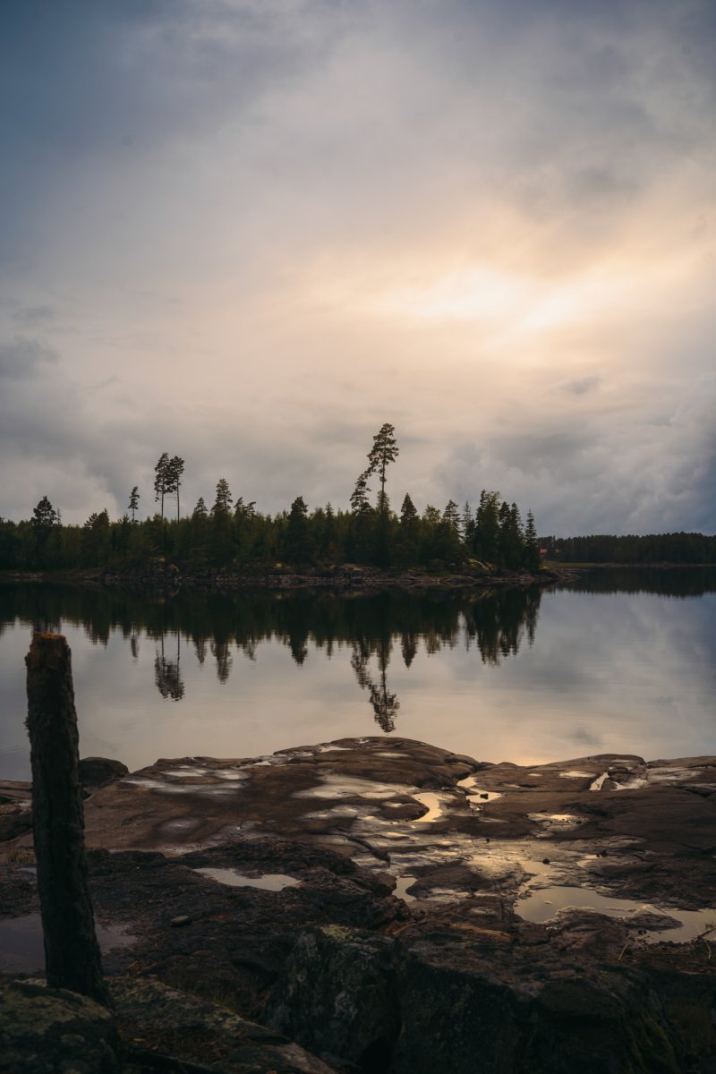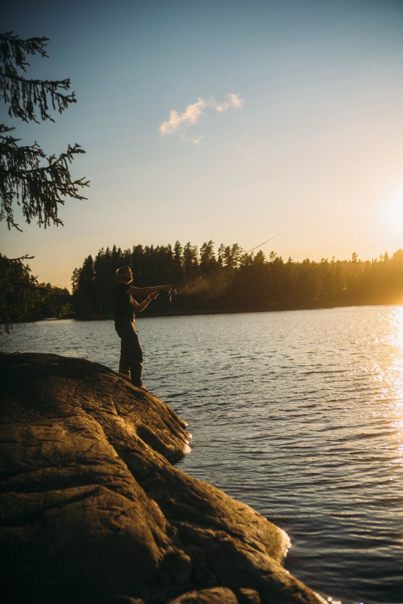 Thore, der andere mit Angelkarte, schloss sich mir an, während Michael indes die bereits vorhandene Feuerstelle aufbereitete, die augenscheinlich schon von vielen anderen Gruppen genutzt, aber aufgrund der vielen lose aufeinander gestapelten Steine individuell umgebaut werden konnte. Nach knapp zwei Stunden erfolglosen Abklapperns von Schilf- und Seerosengebieten mit dem Kanu und dem ständigen Wechsel der Köder von Gummifisch auf Blinker/Spinner und zurück machte ich meinen ersten Fang dieser Reise: einen stolzen, ca. 60 cm großen Hecht (messen konnten wir ihn nicht, da wir kein Maßband dabei hatten). Thore holte ihn mit dem Kescher ein und erlöste ihn unmittelbar und waidgerecht von seinem Kampf. Dieser Moment war für mich in zweierlei Hinsicht bedeutend: Zum einen hatte ich die Erkenntnis "Ja, hier kann man Fische fangen und die Woche überstehen", zum anderen war es der erste Fisch, den ich seit 25 Jahren geangelt habe (ich bin 39). "Okay, es klappt noch, es ist tatsächlich Muscle Memory. Vertraue darauf." Thore zog noch einen mittelgroßen Barsch heraus, und wir fuhren mit anbrechender Dunkelheit zurück in unser Lager, wo wir bereits mit dem ersten Feuer in Empfang genommen wurden. Wir nahmen die beiden Fische aus, entschuppten und filetierten sie, und aus ihren Resten kochten wir eine köstliche Fischsuppe. Alle drei wurden satt und wir gingen, so wie von nun an jeden Abend, um kurz nach Mitternacht ins Bett.