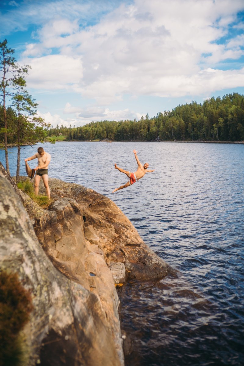 Noch bevor er sich in seine trockenen Ersatzklamotten werfen konnte, kam Michael zurückgepaddelt. Ich fragte ihn über den See rufend, ob er sich vorstellen könne, warum Thore bei dem Wetter nur in Unterhose herumlaufe. Wie aus der Pistole geschossen erwiderte er: "Das kann nur zwei Gründe haben: Entweder kommt er gleich nackt und schreiend auf mich zu und bewirft mich mit brennenden Tannenzapfen, oder aber er ist ins Wasser gefallen." Es ist wohl nötig, diesen Insider für die Lesenden zu erklären. Als ich am Vortag mit Michael zusammen auf dem Kanu unterwegs war, um unser Mittag- und Abendessen zu angeln, kam uns eine große Gruppe von Kanus entgegen. Es waren bestimmt acht bis zehn Personen. Michael nahm geistesgegenwärtig sein Handy in die Hand und begann zu tippen, stoppte aber sofort wieder gedankenversunken. "Wie schreibe ich ihm das möglichst lustig?", fragte er mich. "Er soll sich wie ein Urmensch an die Felsen stellen und sie verjagen", sagte ich. "Genau, ich schreibe ihm: 'Zieh dich nackt aus und mach die brennenden Tannenzapfen bereit, es kommt eine große Truppe an Kanus auf dich zu'." Wir lachten einige Minuten. Natürlich meinten wir das nicht ernst. Aber einen guten Witz lässt man nicht einfach so ungenutzt liegen.