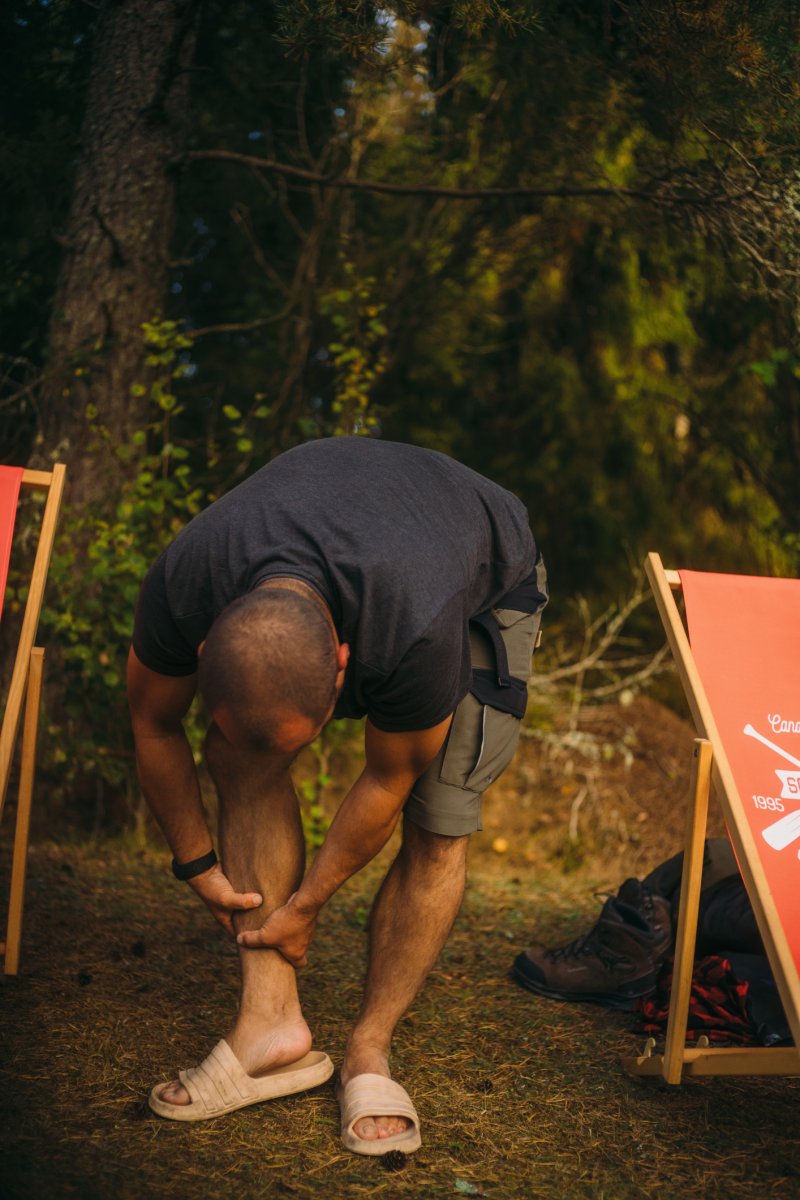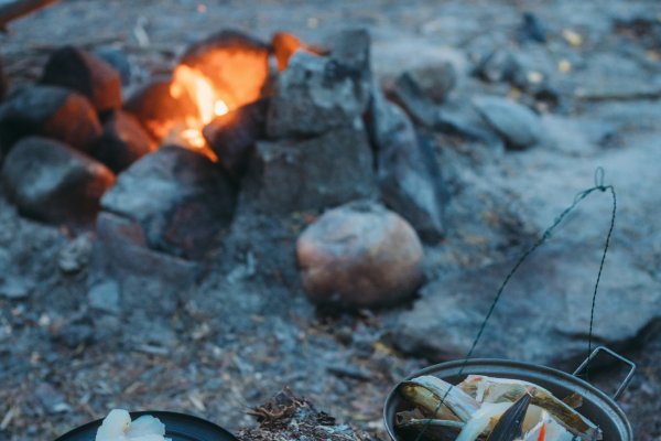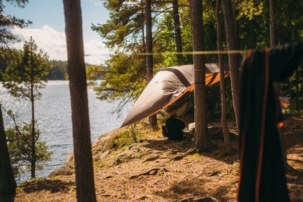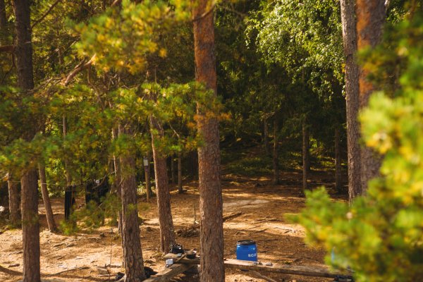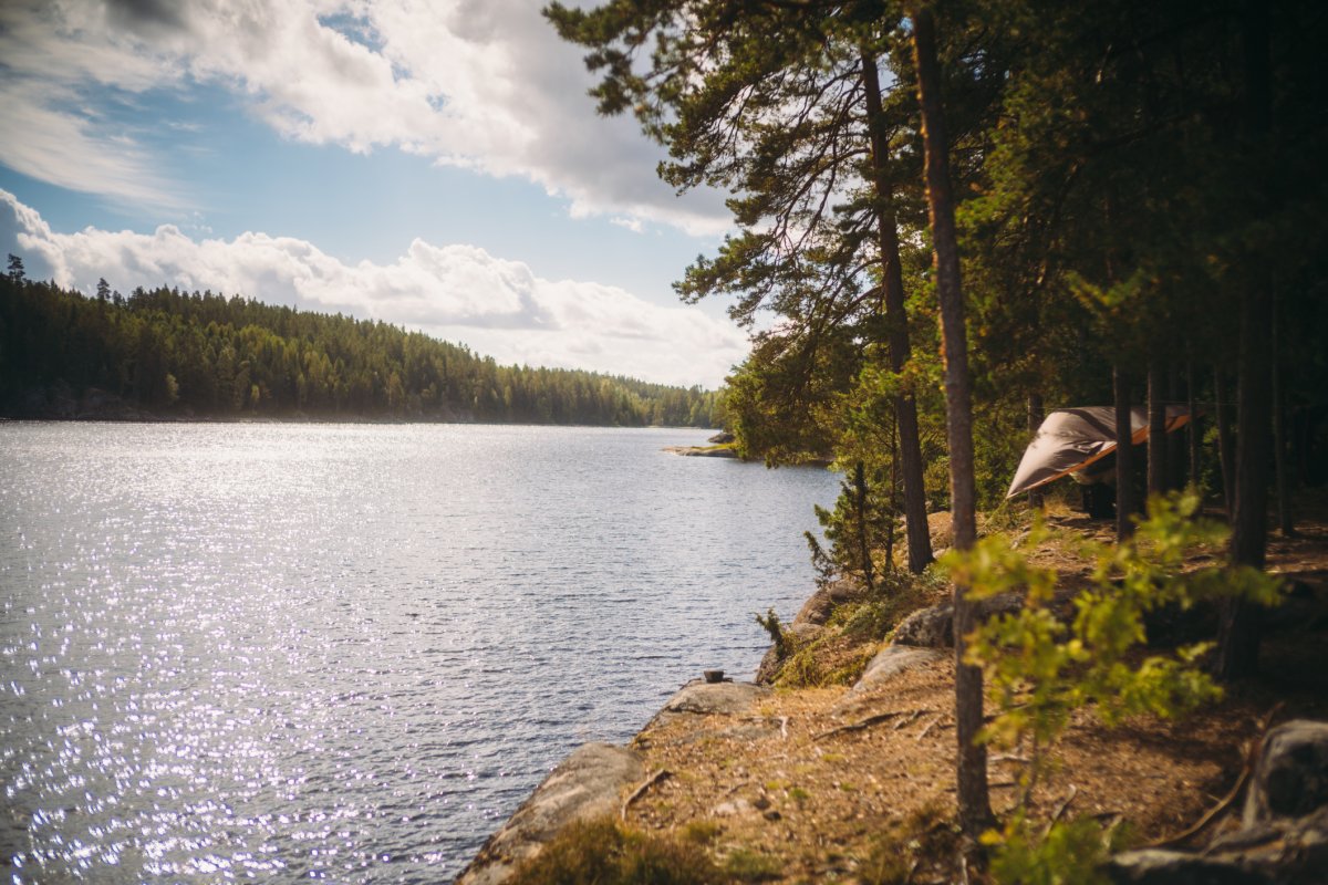 Einen kurzen Moment später fanden seine Schuhe jedoch unter Wasser Halt, und er konnte sich langsam aus eigener Kraft aus der Misere ziehen. Er schaute mich völlig entsetzt an, als wäre nun die gesamte Reise mit ihm wortwörtlich ins Wasser gefallen, und ich fing vor lauter Erleichterung an, lauthals zu lachen. Das steckte auch Thore an, und wir lachten gemeinsam über die absurde Situation, als wir uns beide dabei erwischten, wie uns abermals Mattins Worte in den Sinn kamen: "Einfach mal was Schönes machen". Als die Sorgen dann endgültig abgeschüttelt waren, zog Thore seine komplett durchnässte Regenkleidung aus und hing sie zum Abtropfen in das verlassene Camp, welches sich uns dort wie eine unverhoffte Fügung offenbarte. Am Ende des großen Felsvorsprungs befand sich nämlich ein kleines Waldstück mit einer fürstlichen Feuerstelle und gerade so viel Platz, um unsere drei Tarps und Hängematten aufzuhängen. "Die Natur hat entschieden: Wir bleiben heute hier", sagte ich. "Wir müssen nur noch Michael davon überzeugen." Ich fuhr mit der Beschaffung des Mittagessens – dem Fischen – fort, während Thore schnurstracks, routiniert, aber noch etwas nachdenklich über das, was eben passiert war, sein Lager aufbaute.