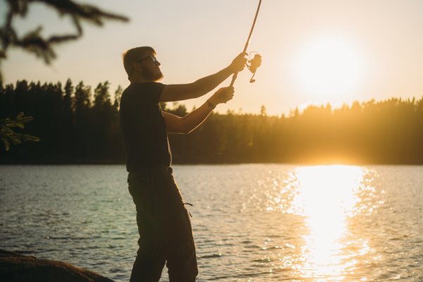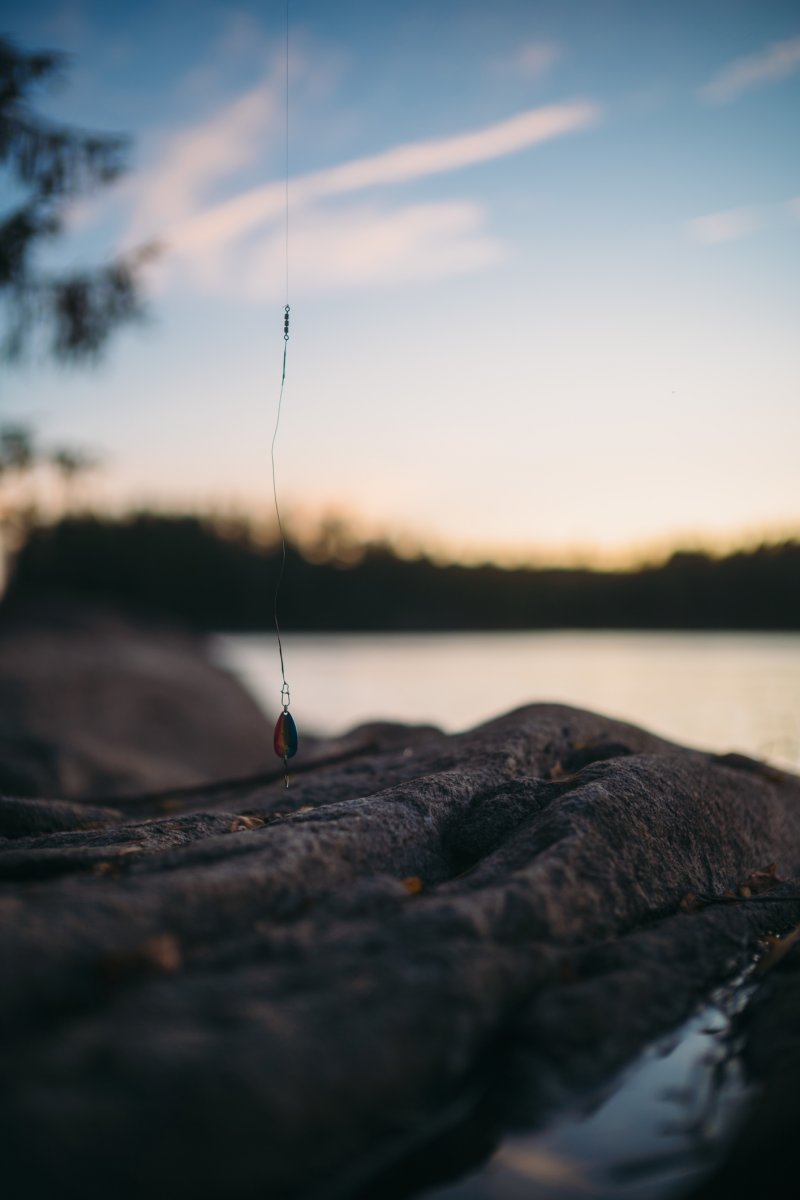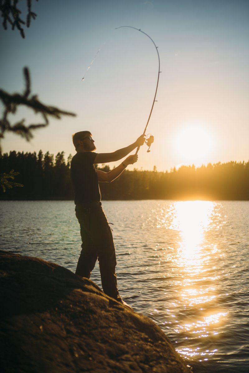 Kurz bevor die Sonne unterging – das war in etwa um 19:30 Uhr (denn um 20:15 Uhr sollte sie hinter dem Horizont verschwinden) – wurden wir in unserem Angelvorhaben etwas ernsthafter, auch weil der Magen sich langsam wieder mahnend und ächzend zu Wort meldete. Wir wussten, dass die Fische jetzt besser beißen. Wir fokussierten also verdächtige Buchten mit Schilf und Seerosen, warfen unsere Gummifischköder wieder und wieder aus, bis es plötzlich den ersten Schlag in der Rute gab. Eilig kurbelte ich an der Rolle, die unter dem Widerstand immer wieder mit ihrer Bremse nachgab. Es war ein kurzes Hin und Her, und wir sicherten den ersten Hecht des Abends mit knapp 55 cm per Kescher. Ich verlor keine Zeit, warf denselben Köder direkt wieder aus und – boom – direkt der nächste Biss. Das konnte doch nicht sein. Stellen die Fische ihre Uhr so sorgfältig wie die Deutschen ihre für den Tatort? Ich zog den zweiten Hecht mit etwas kleineren Maßen heraus, löste den Haken und ließ den Köder wie gewohnt neben mir ins Wasser fallen. Plötzlich zog es an meiner Rute, während ich noch dabei war, den Hecht rasch durch einen Herzstich von seinen Leiden zu erlösen. Fast wäre sie ins Wasser gefallen, und ich konnte sie gerade noch packen. Es hing tatsächlich ein weiterer Hecht am Köder, der anscheinend derart hungrig war, dass er selbst auf ein lebloses Fischimitat direkt neben einem geschäftig rumpelnden Kanu biss. Leider schüttelte er sich im selben Moment, als ich die Rute ergriff, mit einem majestätischen Sprung aus dem Wasser und löste so den Haken. Das war verrückt. Wir konnten es kaum glauben. Nach dieser für mich sehr intensiven Sequenz zog Thore noch einen Barsch heraus, bevor die Sonne sich hinter dem Horizont verneigte und das ganze Spektakel so abrupt endete, wie es begonnen hatte. Nichts biss mehr. Nichts bewegte sich mehr im Wasser. Eine halbe Stunde Zeitfenster, in dem die Fische wie angestochen auf alles reagierten, was sich bewegt – oder, wie sich zeigte, auch nicht bewegt.