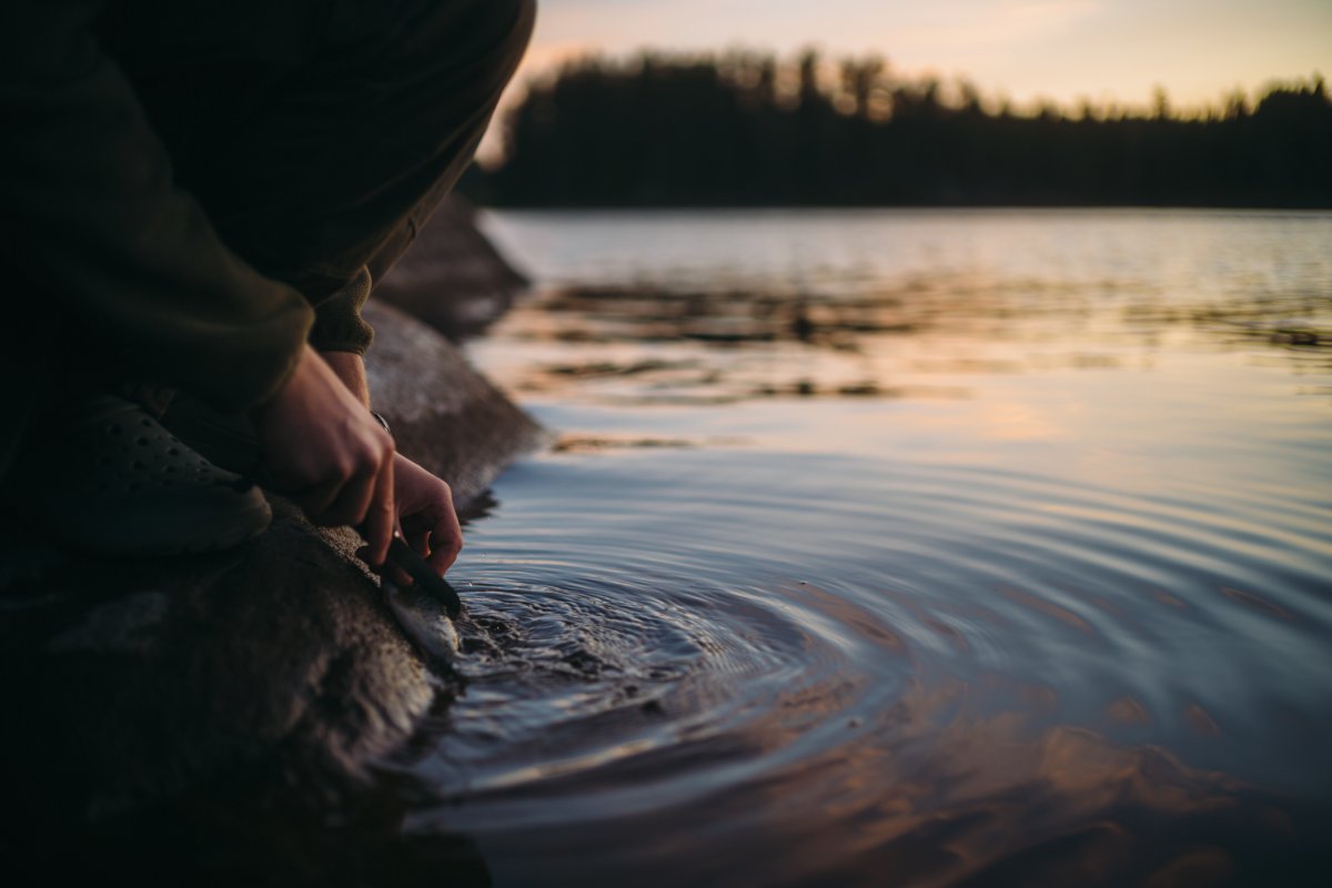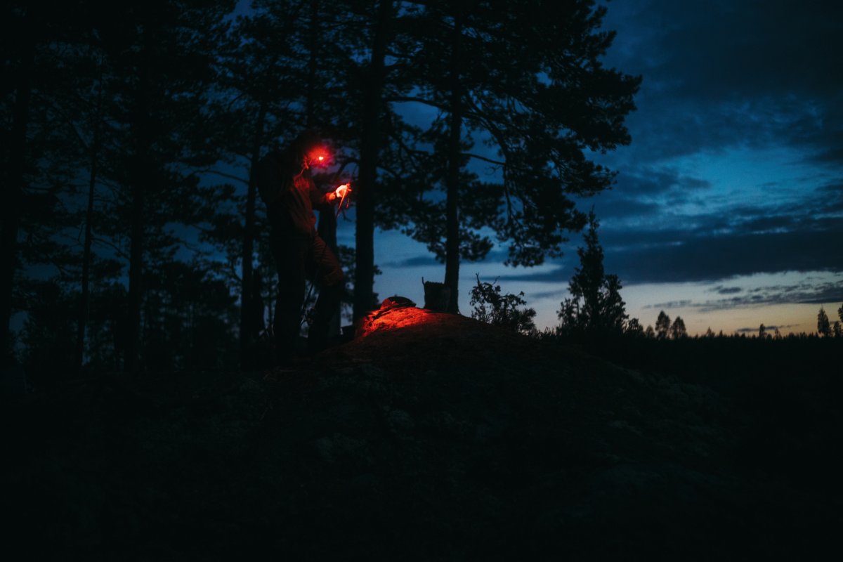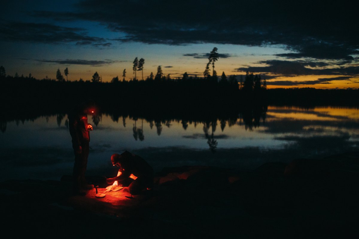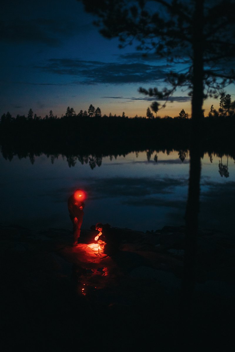 Michael filetierte den letzten Fisch unserer Reise auf den Felsen vor einer Kulisse, die nur schwer in Worte zu fassen ist. Die Regenwolken des Tages brachen zum Sonnenuntergang hin auf, und einzelne Sonnenstrahlen durchstießen sie wie riesige Laser, die einige Wald- und Wasserflächen in gleißendes Licht tauchten. Der Kontrast des grauen Himmels und der Abendröte sah aus, als würde in der Ferne eine große Stadt lichterloh brennen. Währenddessen hatte Michael drei Rotlicht-Taschenlampen und seine Kopflampe um das Schneidebrett drapiert und eine perfekte, fast chirurgische Ausleuchtung für den Hecht geschaffen. Das Filetieren war für ihn zu einem routinierten Handwerk geworden. Mir blieb nichts anderes übrig, als meine Kamera zu zücken und so viele Fotos von der Szenerie zu machen, wie ich konnte.