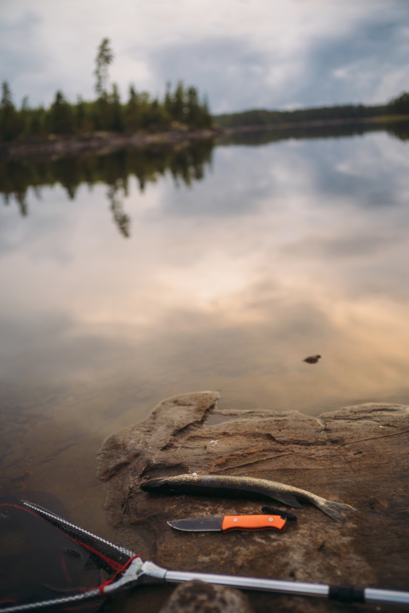 Die Tagesroutine des bevorstehenden ersten Tages sollte sich im Wesentlichen ums Angeln und Verfeinern des Camps drehen. Gegen Mittag – nach ca. drei Stunden erfolglosen, stumpfen Auswerfens und Einholens der Angel von einer nahegelegenen Landzunge – biss plötzlich ein kleinerer, knapp 50 cm großer Hecht. Und ich war extrem erleichtert. Das Mittagessen war gesichert. Auch hier verfeinerte Michael weiter seine Filetier-Skills, die er sich zuvor nur per YouTube angeeignet hatte. Eine kleine Anekdote am Rande: Er hatte sich von einem japanischen Messerschärfer beide frisch gekauften Messer auf traditionelle japanische Art (mit Wassersteinen, per Hand) schleifen lassen. Das zahlte sich jetzt aus, denn das Lösen der Filets von den Gräten und auch von der Haut ging einwandfrei.