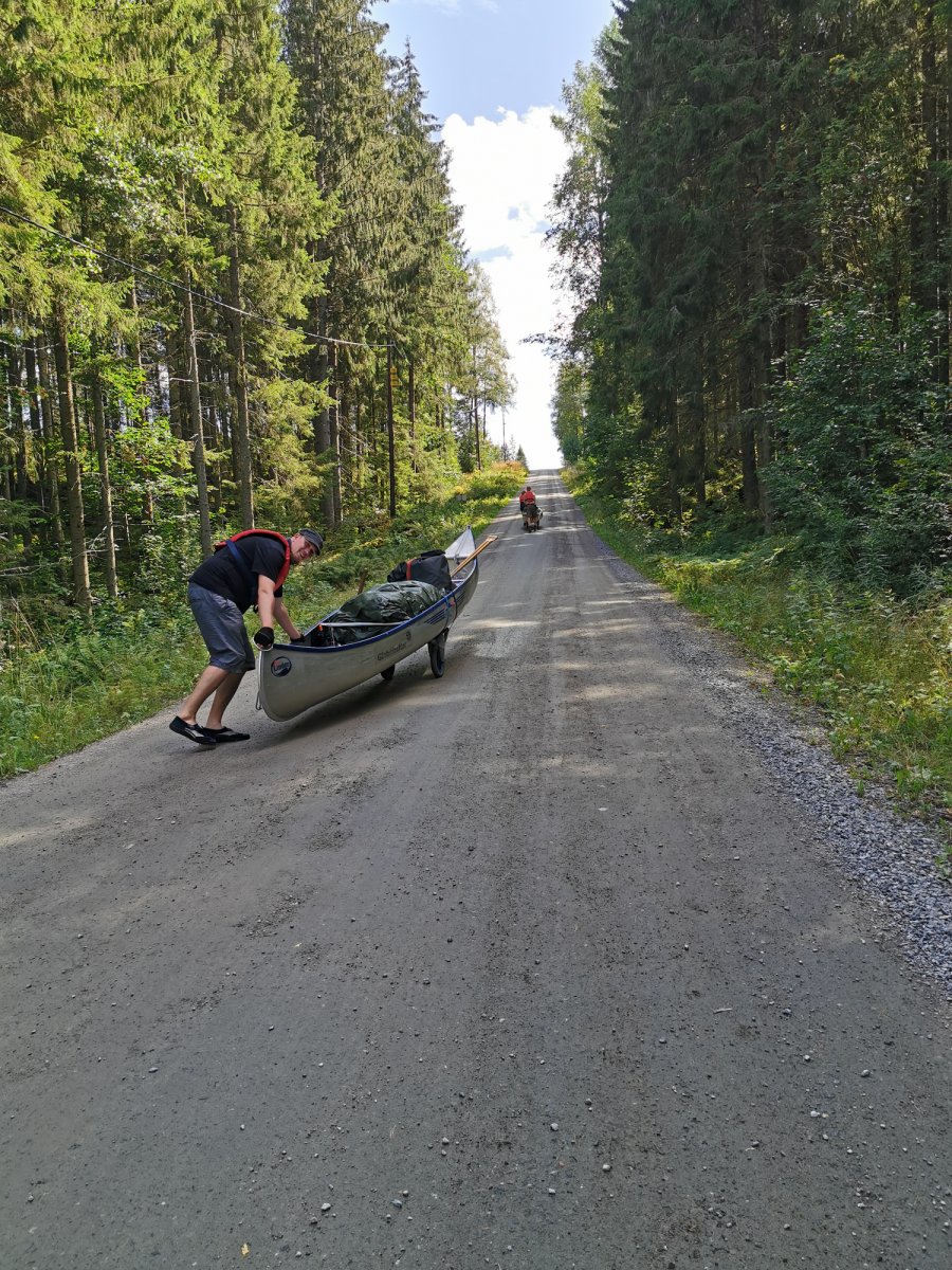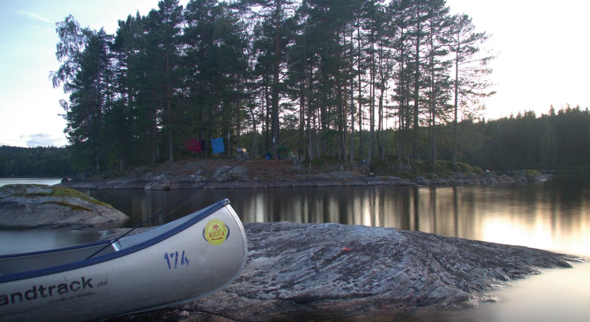 Wir haben uns gestern nicht mehr für einen der offiziellen Rastplätze entschieden. Das heißt zwar, dass wir auf ein Feuer zum Kochen verzichten mussten, dafür jedoch alleine den nächtlichen Geräuschen aus dem Zelt lauschen konnten. Bei absoluter Windstille raschelte jedoch weder ein Blatt, noch das Wasser brach sich an den steinigen Ufern. Daher wurden wir selbst in tiefster Nacht durch jedes noch so leise Knacken am Waldboden aufgeschreckt und werteten es als einen sich ungeschickt anschleichenden Ninja-Elch. Mit jeder kommenden Nacht wurde der Schlaf jedoch tiefer und erholsamer, sodass wir in Verbindung mit dem morgendlichen frisch aufgebrühten Kaffee gestärkt und ausgeruht ins Kanu steigen konnten.