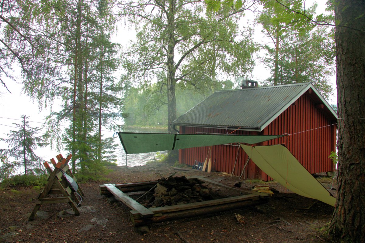 Das Lager während der zwei Regentage konnten wir mit den Scandtrack-Tarps von uns und 2 weiteren Kanuten und Wanderern wind- und wettergeschützt herrichten.
