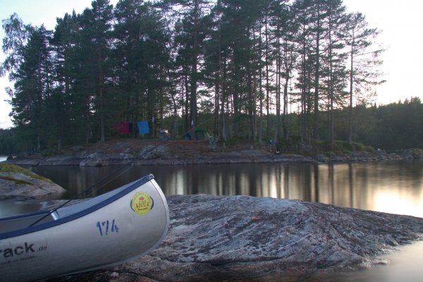 Die Sonne schien die ersten Tage am wolkenlosen Himmel. Selbst mit ausreichendem Sonnenschutz und angefeuchteten Mützen wurde es uns zu heiß auf dem Wasser, sodass wir uns entschieden, vormittags den Großteil der geplanten Strecke zu paddeln und über die Mittagszeit Siesta zu machen. So konnten wir in unserem Urlaub die beiden Seen, Övre Gla und Stora Gla komplett befahren und es blieb dennoch genug Zeit zum Baden, Schnitzen, Lesen und Angeln. Da sich der Erfolg beim Angeln mit Gummifischen jedoch leider in Grenzen hielt, mussten wir regelmäßig vom reichlichen Proviantpaket Gebrauch machen.