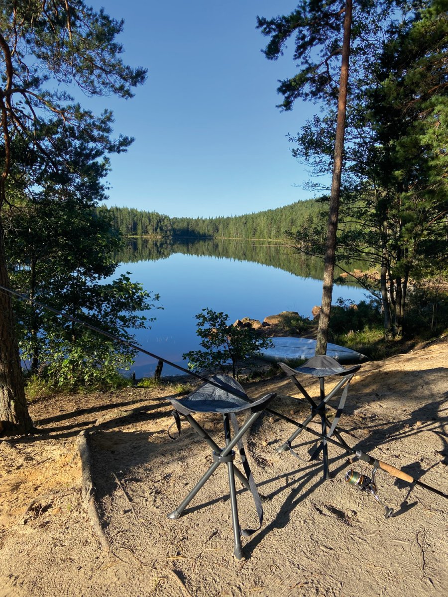 Unser Startpunkt war der große See Övre Gla. Der Wind türmte Wellen auf, und für einen Moment hatte ich das Gefühl, auf dem Meer zu sein. Am Abend wurden wir dafür belohnt: ein Sonnenuntergang wie gemalt, während die Angel ausgeworfen wurde – unser erster Abend im Rhythmus der Natur. Es fühlte sich an, als ob die Welt für einen Augenblick stillstand, nur wir und das goldene Licht über dem Wasser.