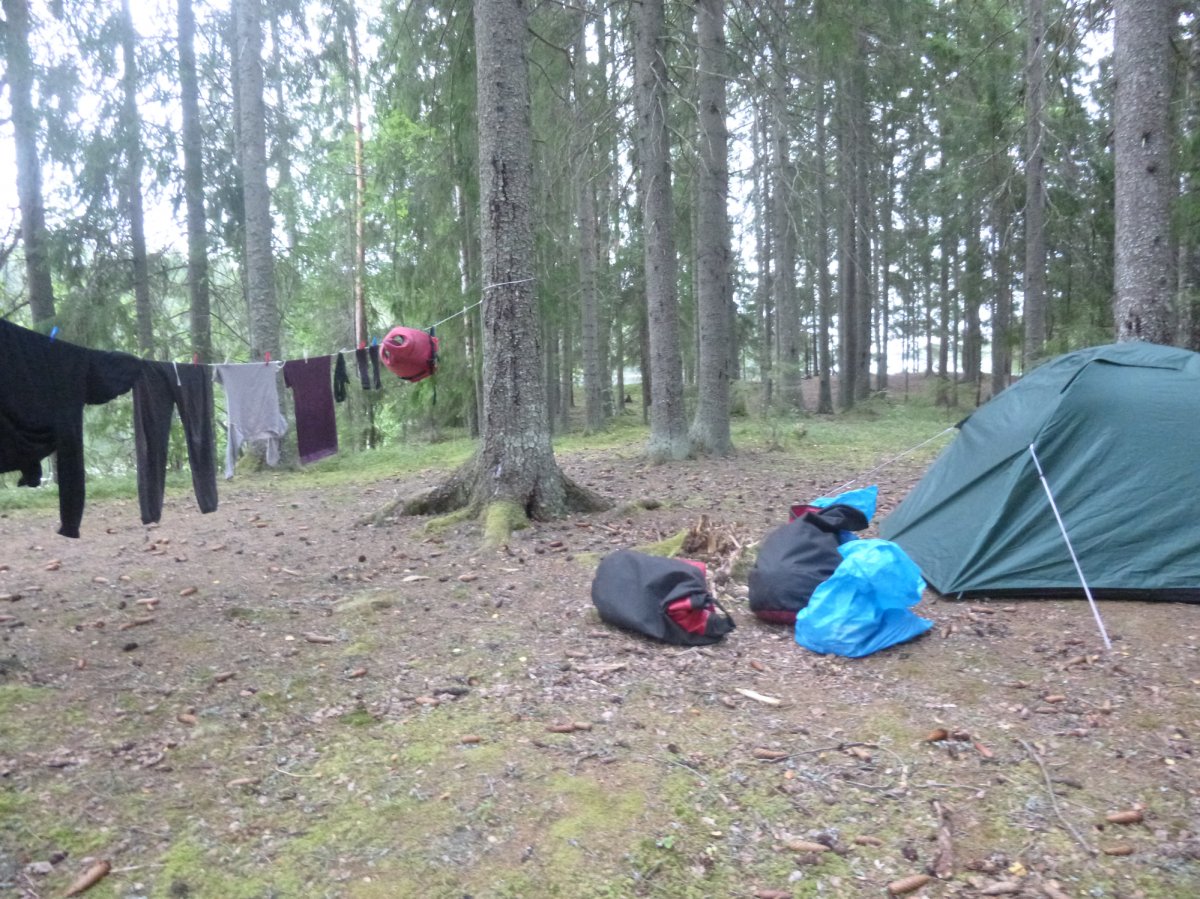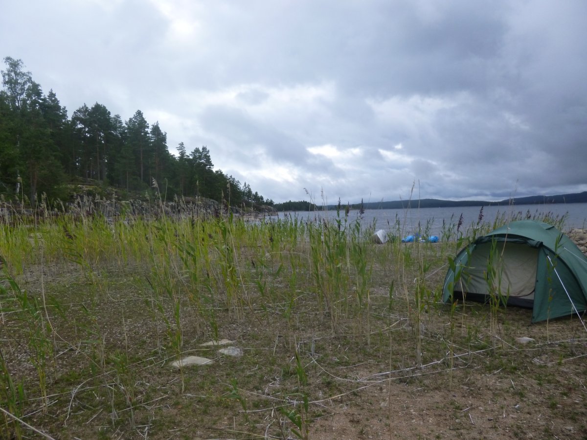 Dann bringen wir das Material runter zur Wasserstelle. Einmal laufen reicht da nicht. Manche unserer Mitreisenden tragen das Paddel über den Schultern, an jeder Seite hängen Beutel. So schafft man es vielleicht, nur einmal laufen zu müssen. Wir laufen öfter. Unten angekommen, bekommen wir das Boot. Wir laden alles in das Boot ein-etwas das wir in der nächsten Woche noch unzählige Male machen sollten- und schieben das Boot ins Wasser. So, der erste richtige Schock für mich Frostbeule sollte der Weg vom Ufer ins Boot sein. Ich dachte, man könne gemütlich einsteigen und losfahren. Nein. Man muss die Schuhe ausziehen und durchs Wasser ins Boot steigen. Ein no go bei dem Wetter für mich. Und danach mit nassen Füßen wieder in die Schuhe? Das Handtuch ist ja irgendwo ganz unten in irgendeiner Tasche.. Ja, ich bin eine sehr sehr sehr dolle Frostbeule und muss zugeben, dass ich in dem Moment wirklich dachte „Was zum Teufel tue ich hier?“. Mein Freund hat glaube ich etwas Mitleid mit mir und schafft es, das Boot inklusive mir ins Wasser zu schieben. So kann ich mir die nassen Füße sparen. Wir fahren los. Bei Regen. Aber das macht nichts mehr. Es ist ein tolles Gefühl, auf dem Wasser zu sein. Wir entscheiden uns Richtung Norden zu fahren, da man auf dieser Strecke nicht umtragen muss. Wir fahren nur ca 3 Stunden, da wir erst gegen 16 Uhr loskamen. Wir werden müde und entscheiden uns anzulegen. Es ist gar nicht so leicht sich auf einen Platz für das Zelt zu einigen. Geht das wirklich hier? Sind hier nicht zu viele Steine? Schliesslich finden wir eine Stelle und bauen das Zelt auf-das erst Mal von vielen, vielen Malen. Auf einer gegenüberliegenden Insel sehen wir andere Camper von Scandtrack. Es gibt ein gutes Gefühl nicht ganz alleine zu sein. Da wir schon hungrig sind, bauen wir auch den Essensplatz auf, das heißt Picknickdecke raus, Spirituskocher aufbauen, entscheiden was gegessen werden soll, in der Tonne nach den richtigen Lebensmitteln graben, in der grauen Küchenutensilienbox nach den richtigen Materialien wühlen. Wir entscheiden uns für Bohnen mit Speck und Zwiebeln. Direkt richtiges Outdooressen!