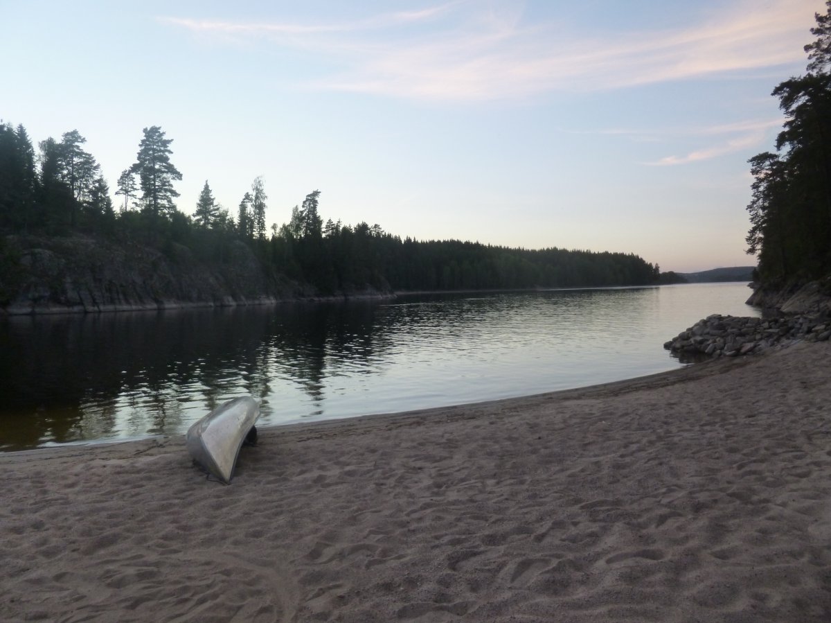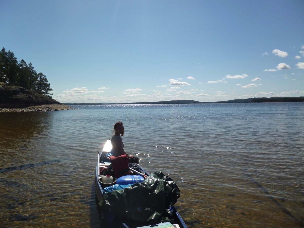 Jetzt heißt es erstmal wieder Schlafsack einpacken, Isomatte zusammenrollen, Zelt zusammenbauen, Boot umdrehen und bepacken. Das Wetter ist heute besser als gestern, also nehmen wir uns vor eine ganze Strecke gen Norden zurückzulegen. Ich schaffe es wieder ohne nasse Füße ins Boot zu kommen. Wir fahren los. Mein Freund hatte Kanufahren schon in der Schule und kann deswegen gut lenken und sitzt daher immer hinten. Wir fahren ein ganzes Stück bis wir an einer unglaublich schönen Bucht vorbei kommen. Dort machen wir Pause. Mein Freund geht dort schwimmen und ich geniesse die Sonne.