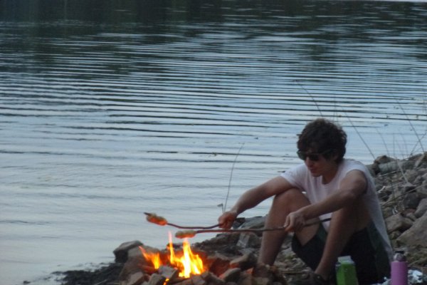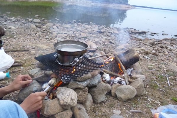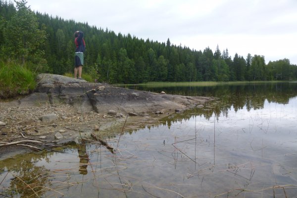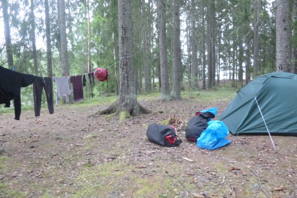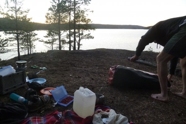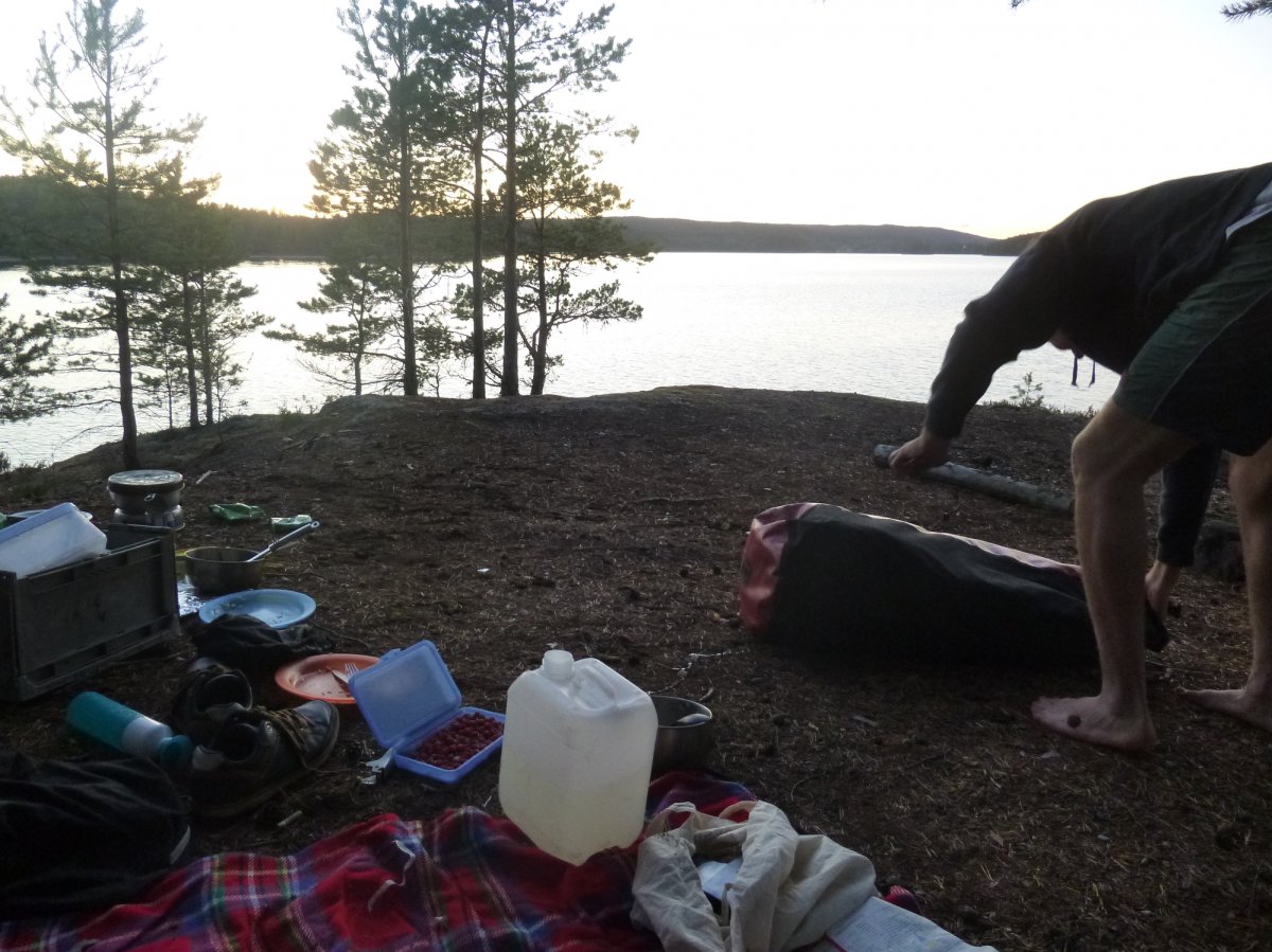 Als wir uns umschauen, bemerken wir, dass wir sogar an der angesteuerten Buch sind. Wir tragen unsere Sachen über die Felsen zu der Bucht. Noch voller Adrenalin beschliesse ich prüde Frostbeule, in den See zu springen und zu baden. Ich bin grade dabei mich auszuziehen als ups da kommen Kajakfahrer. Schnell wieder anziehen. Sie bleiben nur eine viertel Stunde, aber das reicht, um mein Adrenalin so weit zu senken, dass ich danach nicht mehr in den kalten See springe. Wir nutzen die frühe Tageszeit, um Himbeeren zu pflücken, Feuerholz vorzubereiten und –Pilze zu suchen. Dieses mal erfüllen sie alle im Outdoorbuch genannten Kriterien. Ich habe also kein Gegenargument mehr. Heute Abend soll es Pilze geben. Wir bauen einen Steinkreis ganz nah am Wasser. In den Gluten machen wir Alufolienkartoffeln, die Pilze werden auf Stöcken um Feuer angebraten, genauso wie die Würstchen. Da ich denke, dass die Kartoffeln sehr lange brauchen, stelle ich aufs Gitter ein Töpfchen mit Nudelsuppe als Vorspeise. Die Kartoffeln, Pilze und Würstchen sind himmlisch. Die Nudelsuppe ist bis zum Ende nicht warm. Wahrscheinlich steht das Gitter zu hoch über den Flammen. So geht ein weiterer, sehr abenteuerlicher Tag zu Ende. -Natürlich muss erst wieder abgewaschen werden und die Sachen zusammengepackt... Die, durch unsere unsanfte Landung, nass gewordenen Klamotten hänge ich wieder über eine Leine. Wie immer regnet es auch in dieser Nacht. So verabschiede ich mich von dem Gedanken, dass nasse Klamotten jemals wieder trocken werden.