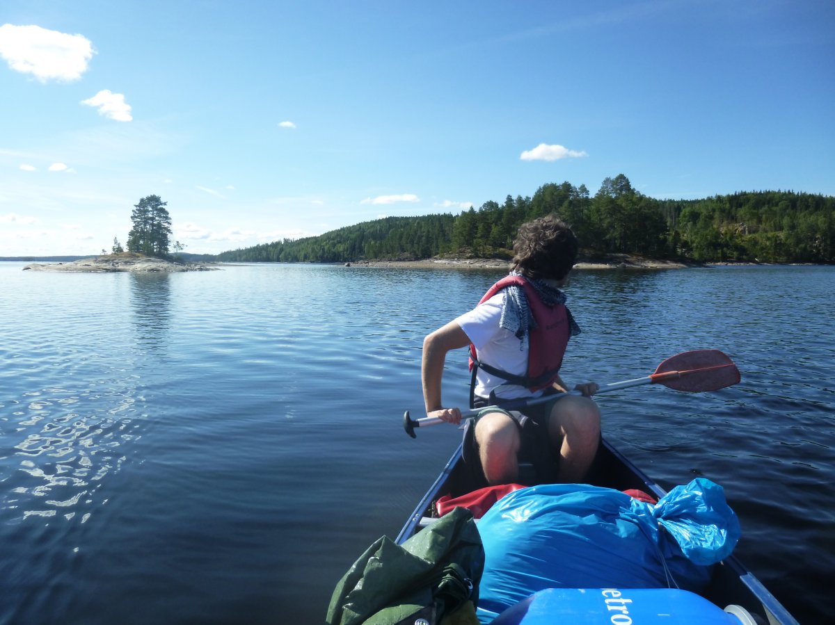 Da es in der Bucht sehr windstill ist, nutzt mein Freund die Gelegenheit um mir das Lenken beizubringen. Also sitze ich hinten als wir weiterfahren. Als die Wellen etwas stärker werden fahre ich irgendwie immer in Eierform. So entscheiden wir uns wieder Plätze zu tauschen. Gott sei Dank wie sich später herausstellen sollte. Wir wissen, dass links von uns die Insel Bäron liegt, aber was ist das was danach kommt? Es sieht aus als wären wir in einer Sackgasse. Erst später sollten wir lernen, dass alles aus der Entfernung wie eine Sackgasse aussieht und man die Wege einfach noch nicht sehen kann, wenn man zu weit weg ist. Wir fragen vorbeifahrende Scandtracker, wo wir sind. „Bei der Insel Bäron glauben wir“. Mh ja soweit waren wir auch, aber geht es da vorne weiter? „Keine Ahnung“. Als wir an der Insel vorbei fahren werden die Wellen erheblich größer und der Wind stärker. Ohje, wir haben keine Ahnung mehr, wo wir hin müssen und ich bekomme Angst, da die Wellen so stark sind, dass sie uns locker zum kentern bringen könnten, falls wir seitlich zu ihnen stehen sollten. Da die Wellen von Westen kommen, fahren wir ihnen einfach entgegen, um nicht die ganze Zeit seitlich zu ihnen zu fahren. Das bedeutet, dass wir auf dem Weg sind, den ca 3 km breiten Fluss zu überqueren. Mein Vater hatte mir vor Abreise Nahe gelegt, dass wir maximal 15 Meter vom Ufer entfernt entlang fahren sollten. Jetzt befinden wir uns auf der Mitte des Sees. Das Ufer hinter uns ist ca 1,5 km von uns entfernt, das Ufer vor uns auch. Und das bei den Wellen. Klasse! Mit aller Kraft paddeln wir der Strömung entgegen, aber irgendwie scheinen wir dem Ufer nicht näher zu kommen. Dafür löst sich aber unsere Plane und fliegt fast weg. Mein Freund fängt sie grade noch auf, während er akrobatisch dafür sorgt, dass unser Kanu nicht seitlich zu den Wellen steht. Nach gefühlten (und wahrscheinlich auch tatsächlichen) 3 Stunden kommen wir an einer kleinen Insel an. Endlich! Sie besteht nur aus Felsen. Also fahren wir weiter. Die kleine Insel danach sieht schon grüner aus. Ich kann mir trotzdem nicht vorstellen, dass wir da einen Platz finden, um das Zelt aufzubauen. Aber wir finden einen. Und einen weiteren sehr schönen Platz, um die Picknickdecke auszubreiten. Ich habe das Gefühl, dass wir wirklich ein Schlaf- und ein Esszimmer haben. Die Insel gehört uns. Ein unglaubliches Gefühl! Jetzt heißt es wieder Boot ausladen, umdrehen, Zelt aufbauen, in der Essenstonne wühlen, Kocher aufbauen... Heute essen wir Reis mit Möhrchen und Erbsen und natürlich Zwiebeln. Das Essen schmeckt uns super gut. Nach dem Abwasch geht es erschöpft ins Zelt.
