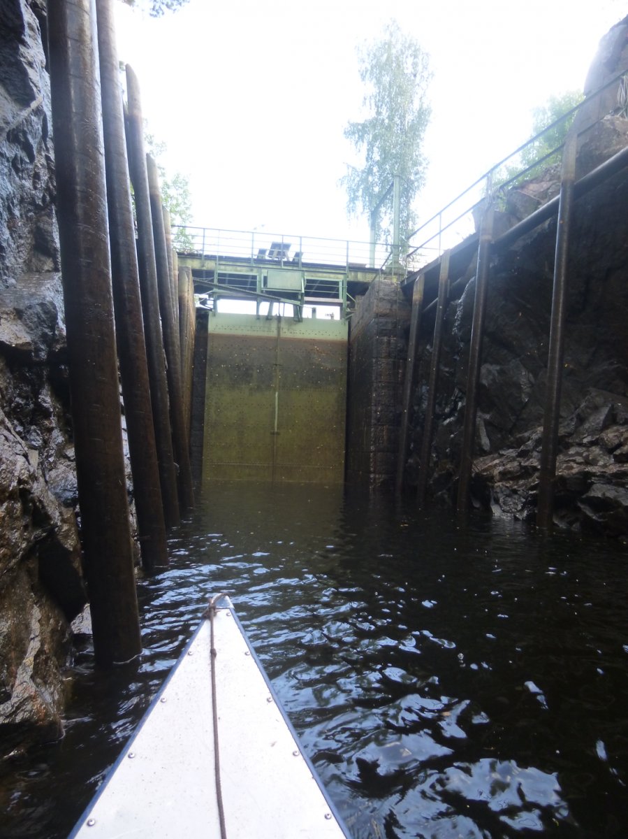 Wir wachen-zum Glück ganz trocken- auf und sind dankbar, dass unser Zelt so gut durchgehalten hat. Meine, zum Trocknen aufgehängte, Wäsche ist durchnässt. Von nun an reisen wir also mit einer Plastiktüte voller nasser Klamotten weiter. Wir frühstücken gemütlich und dann heißt es schon wieder, Boot bepacken und los geht’s. Da wir jetzt bei der Hälfte der Woche angekommen sind, beschliessen wir den Rückweg anzutreten. Wenn wir frühzeitig in der Nähe des Camps sind, dann können wir ja noch einen Abstecher Richtung Osten machen, denn da sind auch noch sehr süße kleine Flüsse. Dass daran später gar nicht mehr zu denken ist, ahnen wir noch nicht. Wir fahren also den wunderschönen Weg wieder zurück und treffen unterwegs zwei Mitreisende. Zusammen schippern wir zur Schleuse. An der Schleuse angekommen, sind wir ein bisschen ratlos, denn der Schleusenwärter scheint bei der anderen Kammer zu sein. Woher weiß er dann, dass wir hier sind? Die drei Jungs beschliessen zur anderen Kammer zu rennen, um den Schleusenwärter zu holen. Ich kann mir nicht vorstellen, dass dies der einzige Weg ist, ihm bescheid zu geben und suche nach einer Klingel. Mein Freund findet eine und sagt dem Schleusenwärter durch eine Art Telefon, dass wir da sind. So wurde den Jungs ein 2 Kilometermarsch erspart. Wir müssen ein bisschen warten, da noch andere Kanufahrer von der anderen Seite durch die Schleuse durchfahren. Die Zeit nutzen wir um unseren Müll bei Coop zu entsorgen und uns mit den Mitreisenden auszutauschen. Wir stellen fest, dass die beiden Jungs schon einige Tage vor uns im Norden ankamen. Sie waren viel schneller als wir. So wie jeder. So oft sehen wir andere Kanufahrer an uns vorbei rauschen und fragen uns, wie die das wohl machen. Der Schleusenwärter erzählt uns, dass es dieses Jahr keine Blaubeeren gibt, da es zu wenig geregnet hatte. Aha. Das erklärt also, warum wir bisher jede Nacht auf Blaubeerstrauchinseln geschlafen haben, aber keine Blaubeeren gesehen haben. Das Schleusentor öffnet sich und wir fahren zusammen mit dem anderen Kanu in die Kammer. Mit einem anderen Kanu zu schleusen macht noch mehr Spaß, denn so muss nur das äußere Kanu das Seil festhalten und klemmt das innere Kanu quasi ein. Unser Kanu steht aussen und so bekommen wir die Seile zugeworfen. Ich erinnere mich noch an die Hinfahrt und weiß, das Seil muss immer kürzer werden und ich muss es immer straff nachziehen. Das stellt sich dieses mal aber viel komplizierter dar. Ich ziehe und ziehe an diesem Seil. Mein Freund meinte später, es sah aus, als würde ich bald abheben. Irgendwann kapiere auch ich, dass die Schleuse dieses mal ja Wasser ablässt, da wir ja auf dem Rückweg sind. Das Seil muss also länger statt kürzer werden.