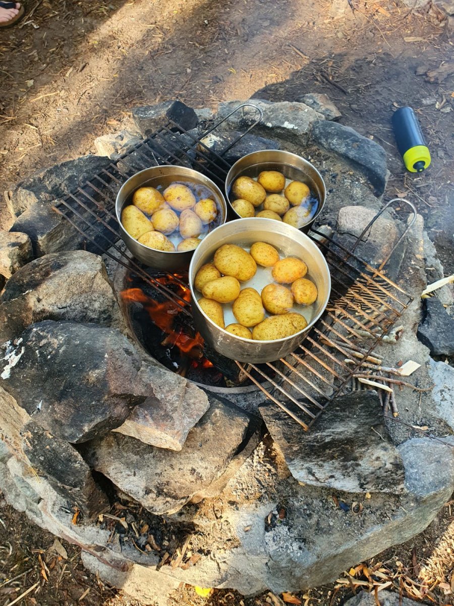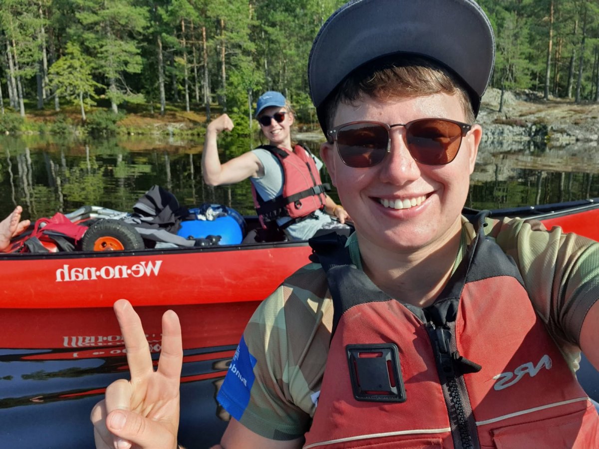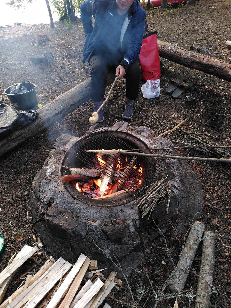 Weil Pferde nicht kotzen können haben wir Richard dabei. Nina war so nett und ergriff die Möglichkeit des Feuer machens, für den morgendlichen Tee. Erfolgreich. Geschwächt und mit etwas navigations unsicher als sonst fuhren wir den Svardlang weiter hinunter. Ein ruhiges Gewässer. Ganz anders als der Lelång, welchen wir die ersten Tage (Tag 1- 3) erkundet hatten. Der Tag startete gelassener, niemand wollte wirklich aus dieser friedlichen Stille ausbrechen und die Fische verschrecken … Nicht das die zahlreichen Angelversuche je Fisch auf den Teller gezaubert hätten. Das Katamaran fahren zwar auf den ersten Blick eine witzige Sache sein kann, effektiv aber nur mehr Stabilität mit sich bringt, fanden wir nach unserer Mittagspause heraus als wir zwei Kanus mit ein paar Holz-Pfählen zu eben solchen verbanden, immerhin hatten wir gleich Holz für unsere nächste Unterkunft, welches wir auch nutzten um über ihm Stockbrot zu grillen