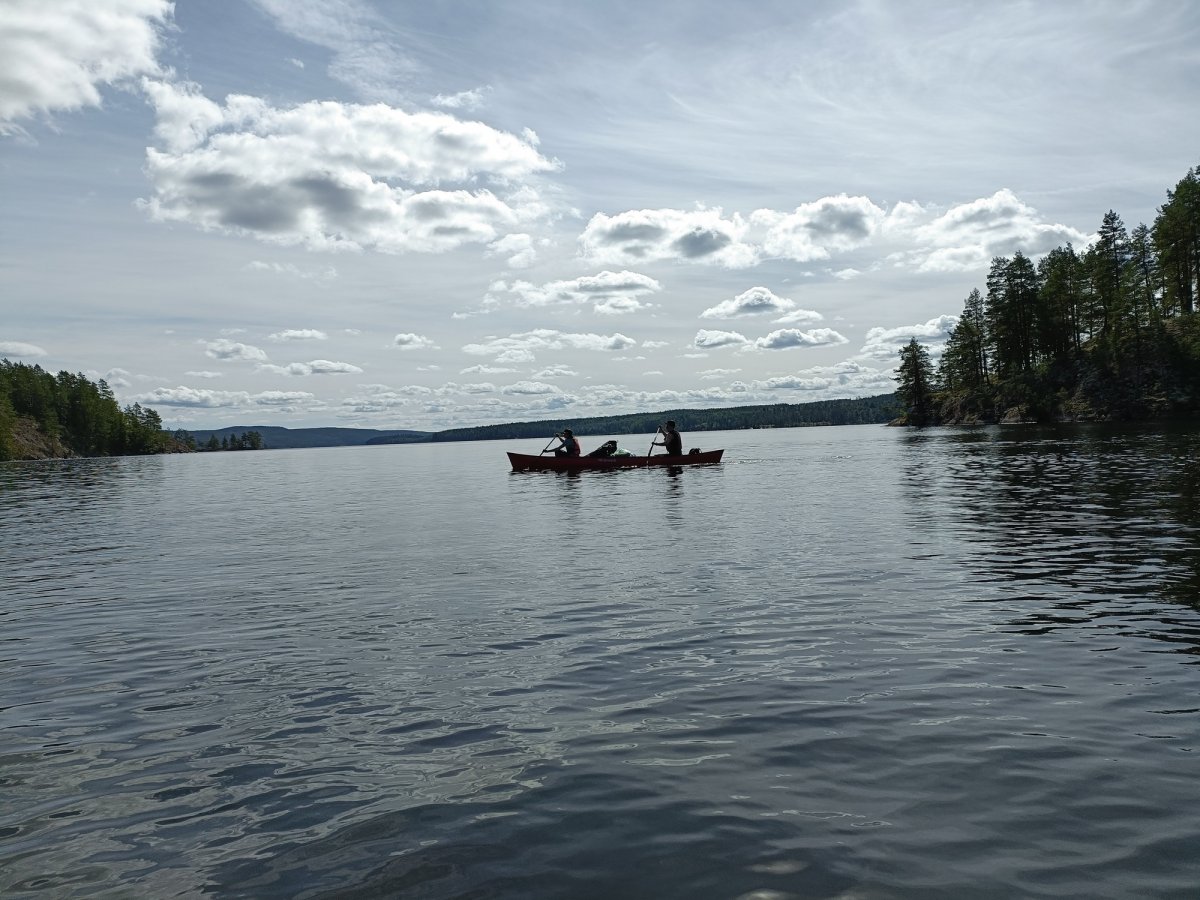 Langsam aber sicher schleicht sich eine gewisse Routine ein: frühstücken, lagerabbau, paddeln, brotzeit, paddeln, lageraufbau, Abend essen, abspülen, Tee am Lagerfeuer, schlafen. (Und vielleicht bei schlechten Bedingungen vor Ort darauf zu achten nicht von Mücken gefressen zu werden). Umso schöner ist es dann auch wenn man ein bisschen Zeit miteinander verbringen kann die sich nicht in diesem funktionellen System bewegt. Obwohl es heute die längste Strecke der geplanten Route war, hatten wir den Nachmittag "frei". Zeit zum Schwimmen. Zeit zum lesen. Zeit zum Beeren sammeln - und Mal ehrlich wann macht man das heut zu Tage noch. Zeit sich über die unterschiedlichen Dialekt lustig zu machen.