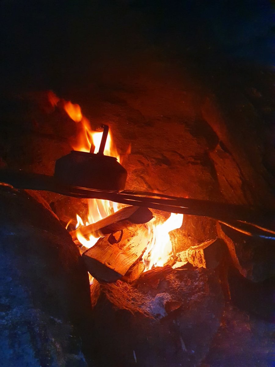 Das Übertragen eine spannende Angelegenheit ist, war die Lektion des heutigen Tages. Erstes Übertragen entpuppte sich als nicht einmal 50m Luftlinie, welche in Sichtweite hinter einer Landstraße lag. Unser heutiges im Gegensatz dazu entpuppte sich als echte Herausforderung. Strecke finden und festlegen, Kanus entladen und aus dem Wasser heben, Kanuwagen unterbauen und transportieren… drei Mal (Daumen drücken das die morgigen drei Stellen mehr der ersten ähneln) Schwedens Seen wurde zum heimischen Baggersee als wir uns nach der Ankunft die Sonne auf den Bauch scheinen ließen. Um zu verhindern dass der Rauch ins Dano zieht entwarfen wir einen Schutz gegen den Wind. Der Rauch zog nun zwar nicht mehr in die Richtung des Holz-verschlages, wirbelte sich aber nun zwischen beiden Seiten hin und her was uns in regelmäßigen Abständen dazu brachte mit der brotzeit in der Hand ein paar Schritte zurück zu treten