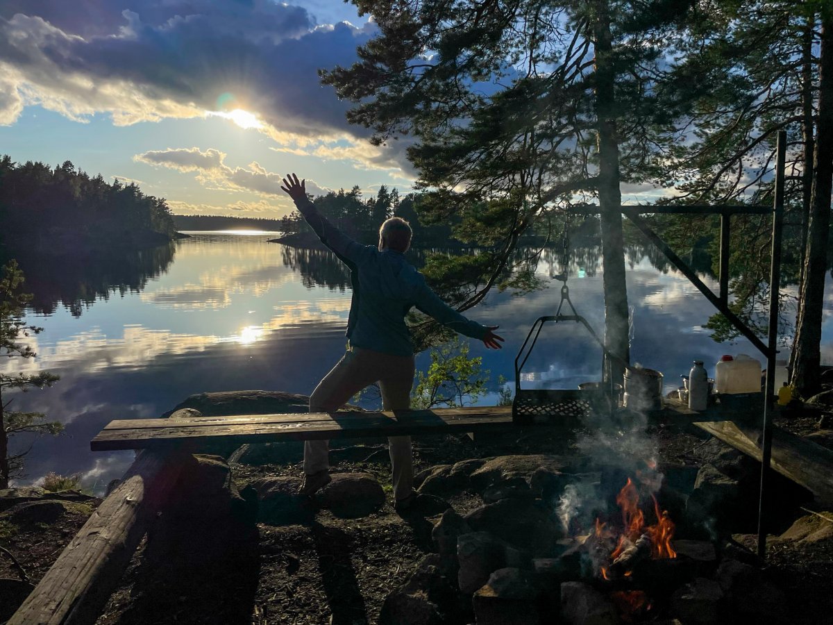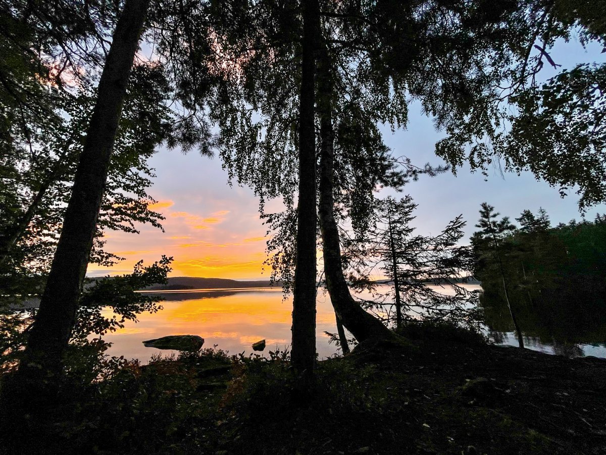 Das rhythmische paddeln auf dem stillen See, weit und breit keine anderen Menschen, fühlt sich sehr meditativ und erholsam an. Bereits nach etwas mehr als einer Stunde kommen wir beim Rastplatz Nr. 53 an. Der Rastplatz ist wiederum sehr einladend und sauber. Zudem ist er grosszügig angelegt und bietet eine tolle Aussicht .... einfach perfekt. Daher entscheiden wir uns über Nacht da zu bleiben. Die Heidelbeersträucher waren voll mit reifen Heidelbeeren. Begeistert pflücke ich die Beeren. Über Mittag kommen noch eine Familie aus Deutschland und ein belgisches Paar. So ist rund um die Feuerstelle gemütliches Beisammen sein. Unser Mittagessen besteht aus belegten Broten. Nach dem Mittagessen erkunden wir die Umgebung auf dem Land zu Fuss und anschliessend die auf dem See noch mit dem Kanu. Am Abend sind wir wieder allein. Nach einem Gemüsereis zum Abendessen, geniessen wir wiederum die romantische Abendstimmung. Bei Mundharmonikaklängen, Fotografieren, am Feuer sitzen, lassen wir den schönen Tag ausklingen. Die Mücken halten wir uns mit Räucherstäbchen und Mückenschutzmittel vom Leibe.