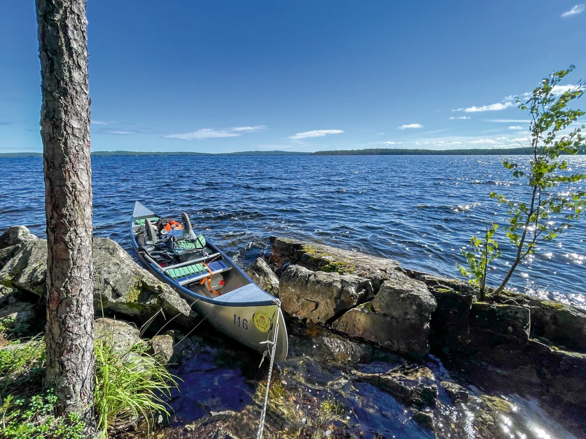Wir fühlen uns wunderbar erholt, als wir am Morgen aufwachen. Das Wetter ist wieder besser. Alles ist jedoch noch sehr nass. Auf der Kanufahrt haben wir wieder von Sonne bis Regen alles. Der Regen zieht allerdings mehrheitlich an uns vorbei. So bleiben wir trotz Regenmontur bis auf ein paar wenige Tropfen trocken. Bereits nach 2 Stunden sind wir am Rastplatz 10. Obwohl wir gerne noch etwas weiter gepaddelt wären, entscheiden wir uns hier zu bleiben. Zum einen, weil uns der Platz super gefällt und zum anderen, weil unsere Kleider tagsüber besser trocknen. Den Tag verbringen wir wieder mit Rastplatz einrichten inkl. Wäscheleinen spannen, Heidelbeeren pflücken, Mittagessen kochen und essen, lesen, im See baden und gemütlich sein.