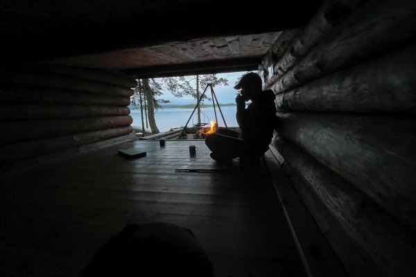 Der heutige Tag zeigt sich bewölkt und windig. Nach einem feinen Frühstücksmüesli mit den herrlichen Heidelbeeren, gehe ich nochmals Beeren pflücken. Wir fahren weiter und suchen uns einen Platz fürs Mittagessen. Der erste offizielle Platz ist uns zu düster, also fahren wir weiter. Oben am See kommen wir zur Schutzhütte Nr. 54. Die ist zwar sehr schön. Doch sie befindet sich direkt an einem Wehr und das Rauschen des Wassers ist sehr laut. Der Platz fühlt sich bei diesem windigen Wetter mit ganz leichtem Nieselregen ebenfalls nicht stimmig an. Wir entscheiden uns den See zu überqueren. Bei diesem Wetter ist der See unruhiger als an den Tagen zu vor und wir erleben zum ersten Mal wie es sich anfühlt, mit, gegen, und quer zu den Wellen zu fahren. Anfangs haben wir noch etwas Respekt. Doch bald entpuppt sich die Fahrt als problemlos und abwechslungsreich. Der Rastplatz Nr. 54 ist noch frei und wieder sehr schön. So entschieden wir uns hier zu bleiben. Somit haben wir genügend Zeit zum Kochen und bereiten uns zum Mittagessen Tortellini an einer Käserahmsauce zu. In der herrlichen Natur gönnen wir uns nach dem Abwaschen einen erholsamen Mittagsschlaf. Den Nachmittag verbringen wir am und im See. Doch da sich die Temperatur durch den Wind kühl anfühlen, wird es kein ausgiebiges baden daraus. Lieber legen wir uns in den Shelter zum Lesen. Am Abend entscheiden wir uns, den Reissalat für das nächste Mittagessen bereits vorzukochen. Schon am Abend zu vor überlegten wir, ob wir im Windfang übernachten wollten. Wir entschieden uns dann jedoch dagegen, weil wir das Zelt, als Moskitoschutz bevorzugten. An diesem Tag hatte Björn die Idee, das Innenzelt in den Shelter zu stellen damit wir geschützt von den Mücken dort schlafen können. So richten wir uns ein lustiges Schlaflager ein, Leider schlafen wir beide sehr schlecht. Wahrscheinlich liegt es daran, dass die Luftzirkulation so nicht optimal ist und der Rauch vom Feuer noch im Windfang hängt. Aber immerhin sind wir jetzt um eine Erfahrung reicher.