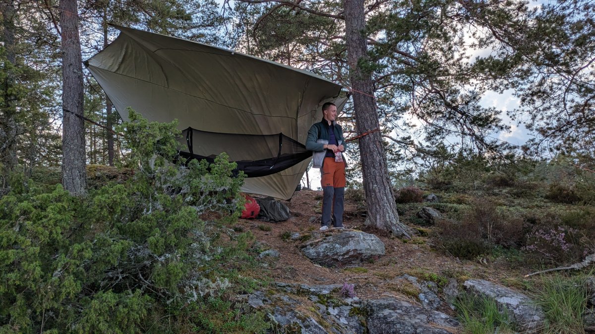 Wir landeten im strömenden Regen an. Die erste Priorität war klar: Tarps über der Feuerstelle spannen und die Zelte aufbauen. Das Manöver war schwieriger als gedacht, doch nach einiger Zeit stand alles. Constantin und ich entschieden uns, die letzte Nacht der Tour im Dano (der Schutzhütte) zu verbringen, packten also nur unsere Schlafsäcke und Isomatten hinein.