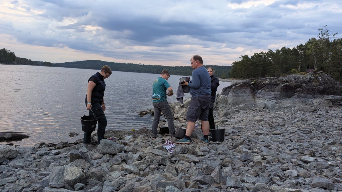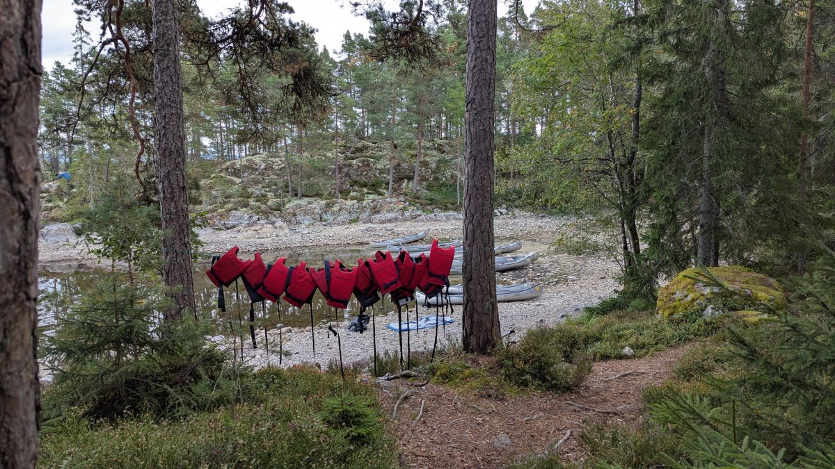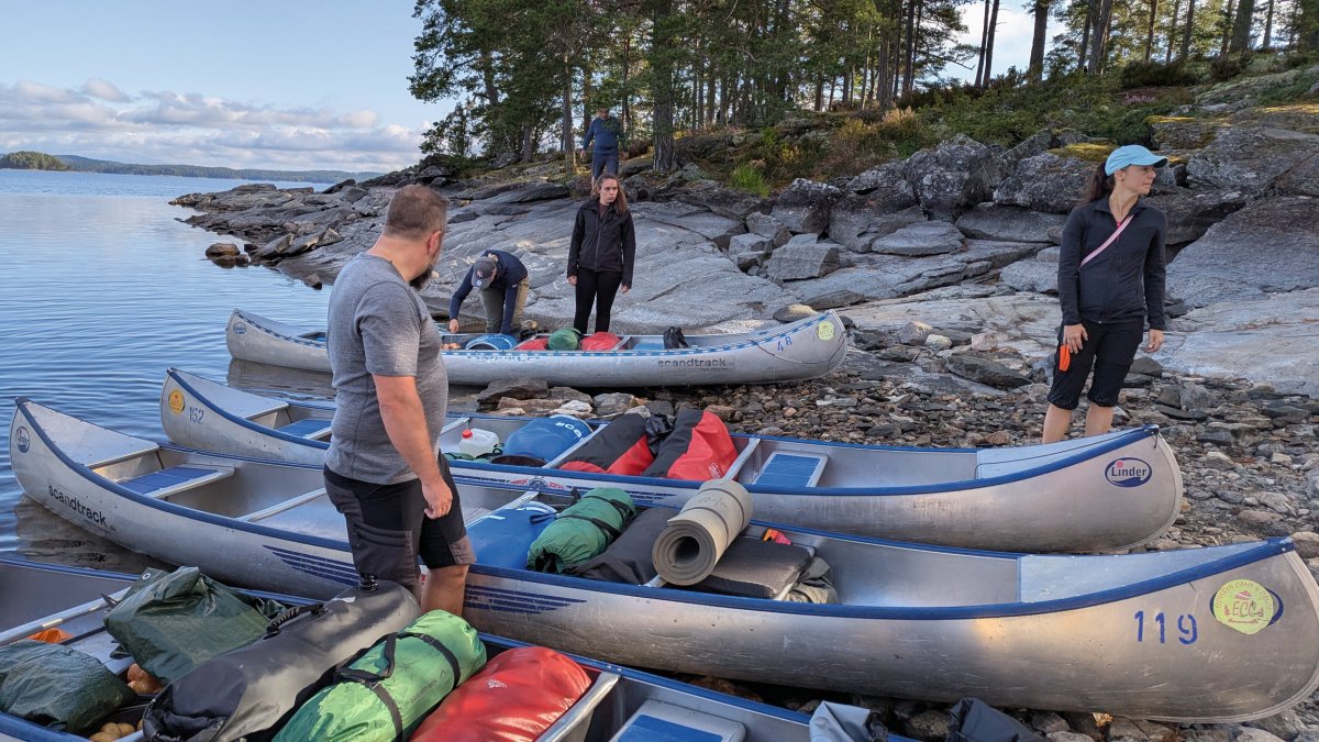 Anschließend präsentierte Holger unsere Tagesetappe auf der Karte: Ein Rastplatz auf der schwedisch-norwegischen Grenze, nur sechs Kilometer entfernt. Die Frage, in welchem Land wir wohl übernachten würden, sorgte für zusätzliche Motivation. Nach einer kurzen Mobilisierung durch Audrey und der obligatorischen Insel-Kontrolle (bei der Lukas humorvoll eine alte Unterhose und Socken fand), besetzten wir unsere Kanus.