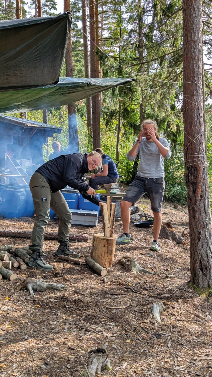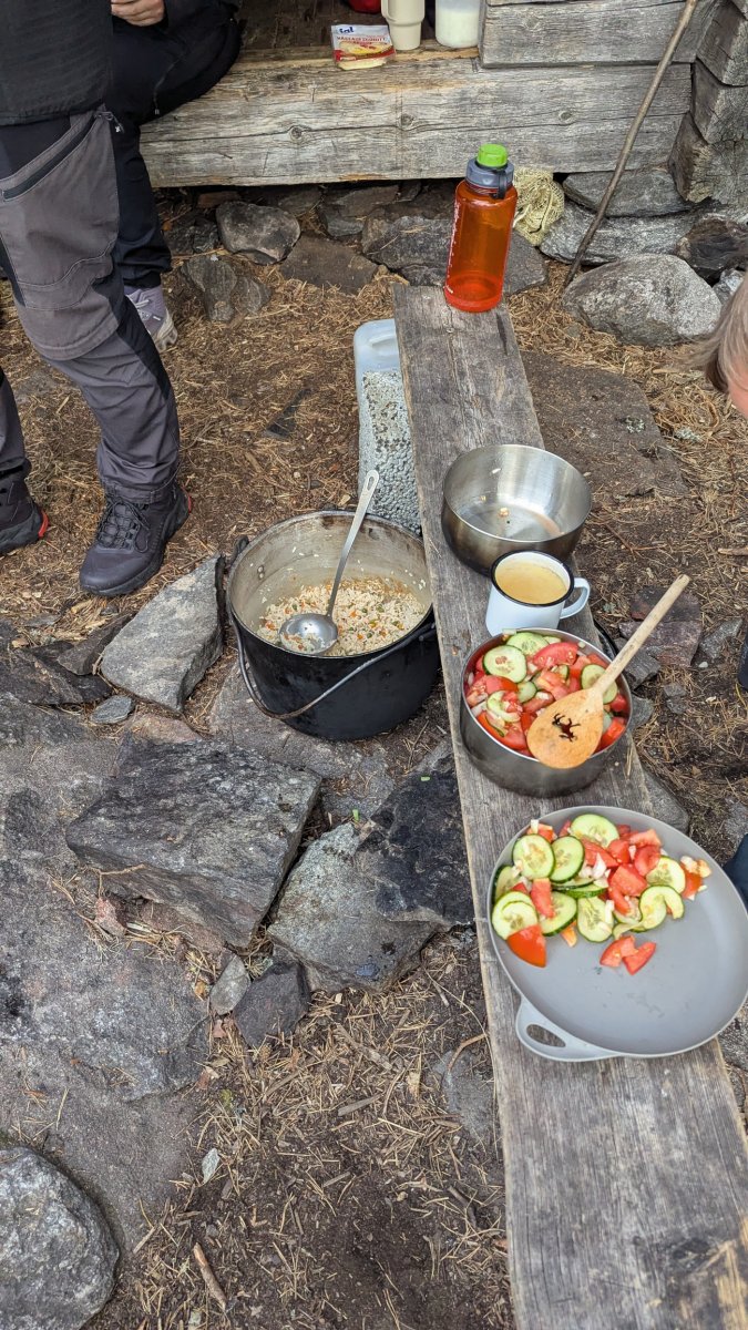 Da wir bereits um 13:30 Uhr mit dem Aufbau fertig waren, gab es ein entspanntes, aber abwechslungsreiches Mittagessen, das von Bockwurst über Instant-Nudeln bis hin zu Milchreis reichte – stets unter der kulinarischen Beteiligung Constantins. Anschließend planten wir die Verpflegung für die kommenden Tage. Für den Abend stand Mirkos „Terence Hill Pfanne“ auf dem Programm, gefolgt von „Elchkötteln“ (Teigkugeln mit Nutella-Überzug), deren Teig Christina und Xenia ansetzten. Constantin und ich füllten währenddessen unseren Holzvorrat wieder auf.