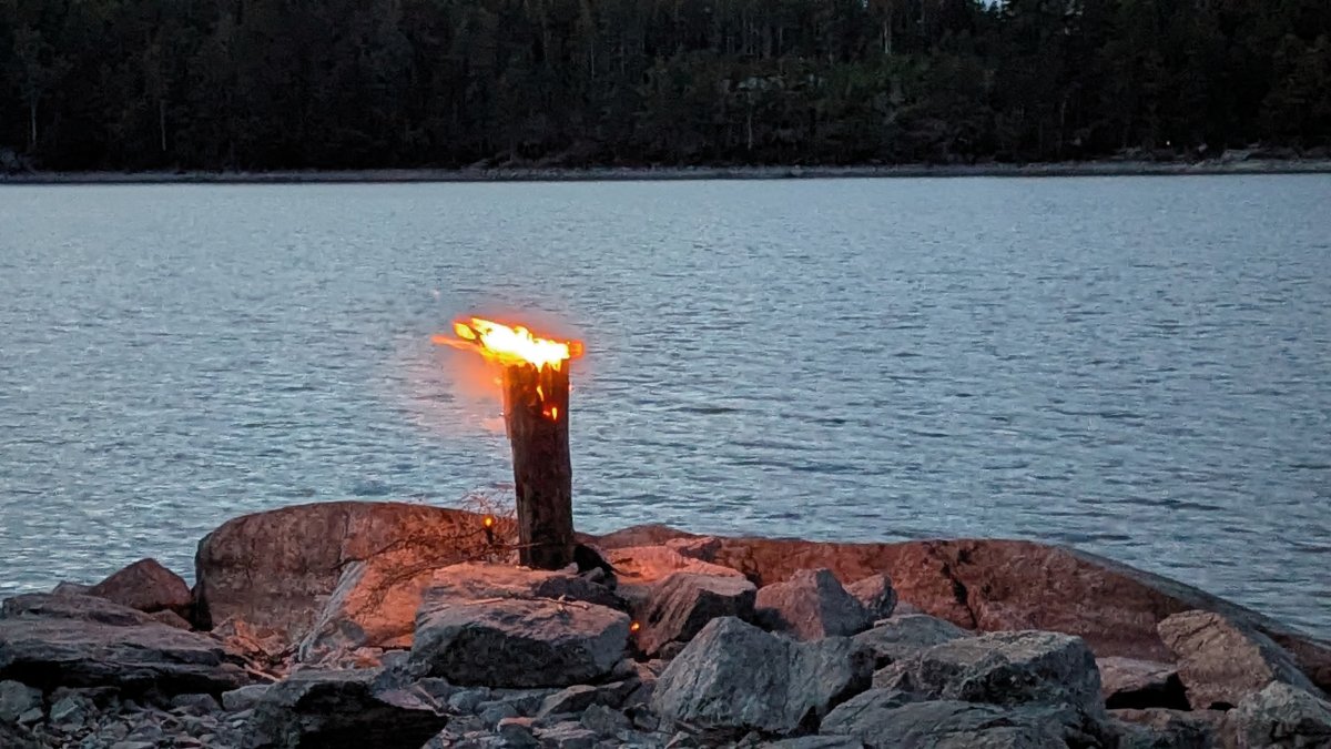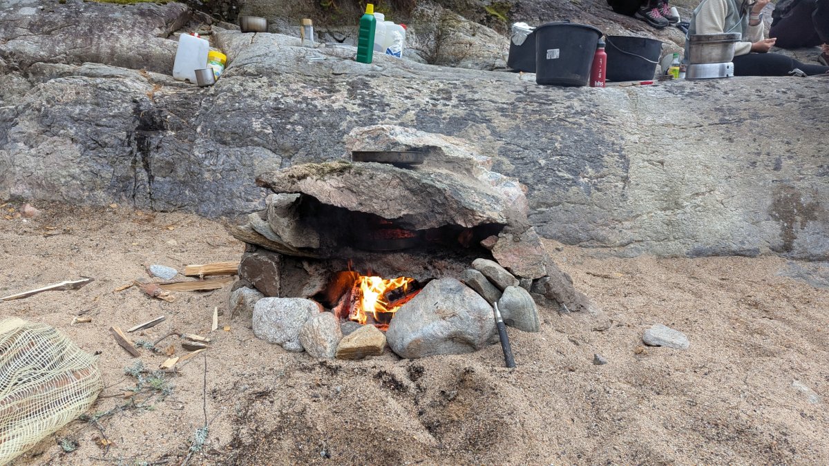 Leider endete mein Versuch, das Schwedenfeuer fertigzustellen, mit einem kurzen Schreck: Eine Sekunde Unachtsamkeit resultierte in einem Schnitt in der Hand. Dank Holgers Erste-Hilfe-Ausrüstung war die Wunde schnell versorgt. Constantin und Mirko übernahmen und stellten das Schwedenfeuer auf ihre eigene Art fertig. Dann waren auch die „Elchköttel“ (Hefeteig mit Nutella-Glasur) fertig, und wir genossen den Leckerbissen. Der Abend endete am Strand, erleuchtet vom glühenden Schwedenfeuer und unter einem klaren Sternenhimmel.
