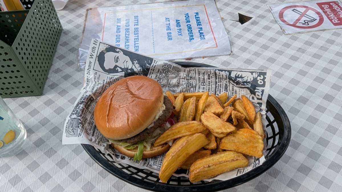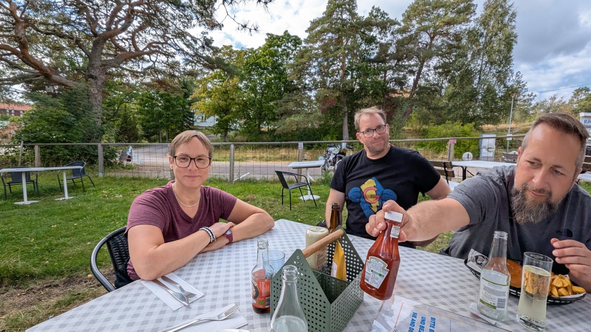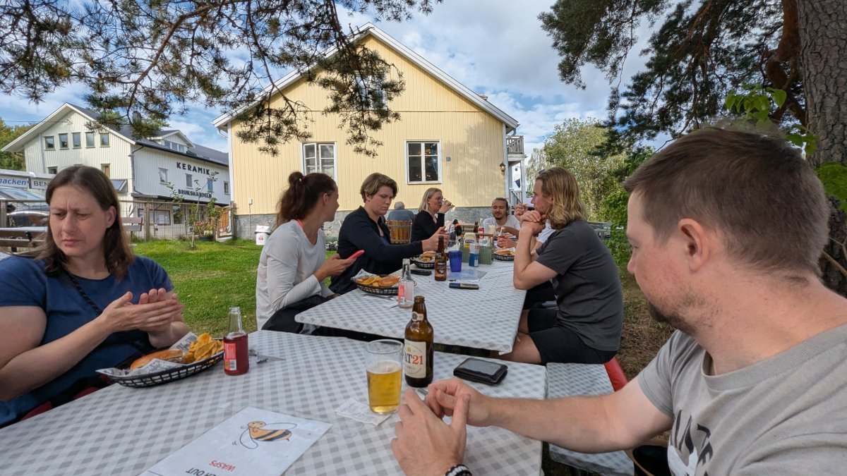 Frisch und gestärkt verpackten wir unsere persönlichen Sachen und machten uns auf den Weg zur grünen Wiese, dem Sammelpunkt unserer Anreise. Von dort aus starteten wir zu unserem letzten gemeinsamen Ausflug: einem 15-minütigen Fußmarsch in den nahegelegenen Ort. Dort in einem kleinen Restaurant bestellten die meisten von uns einen Elch-Burger mit Pommes. Es war ein wahrer Genuss, die Reise bei leckerem Essen und kühlen Getränken in der Sonne ausklingen zu lassen. Maren und ich gönnten uns zum Abschluss noch ein Eis.