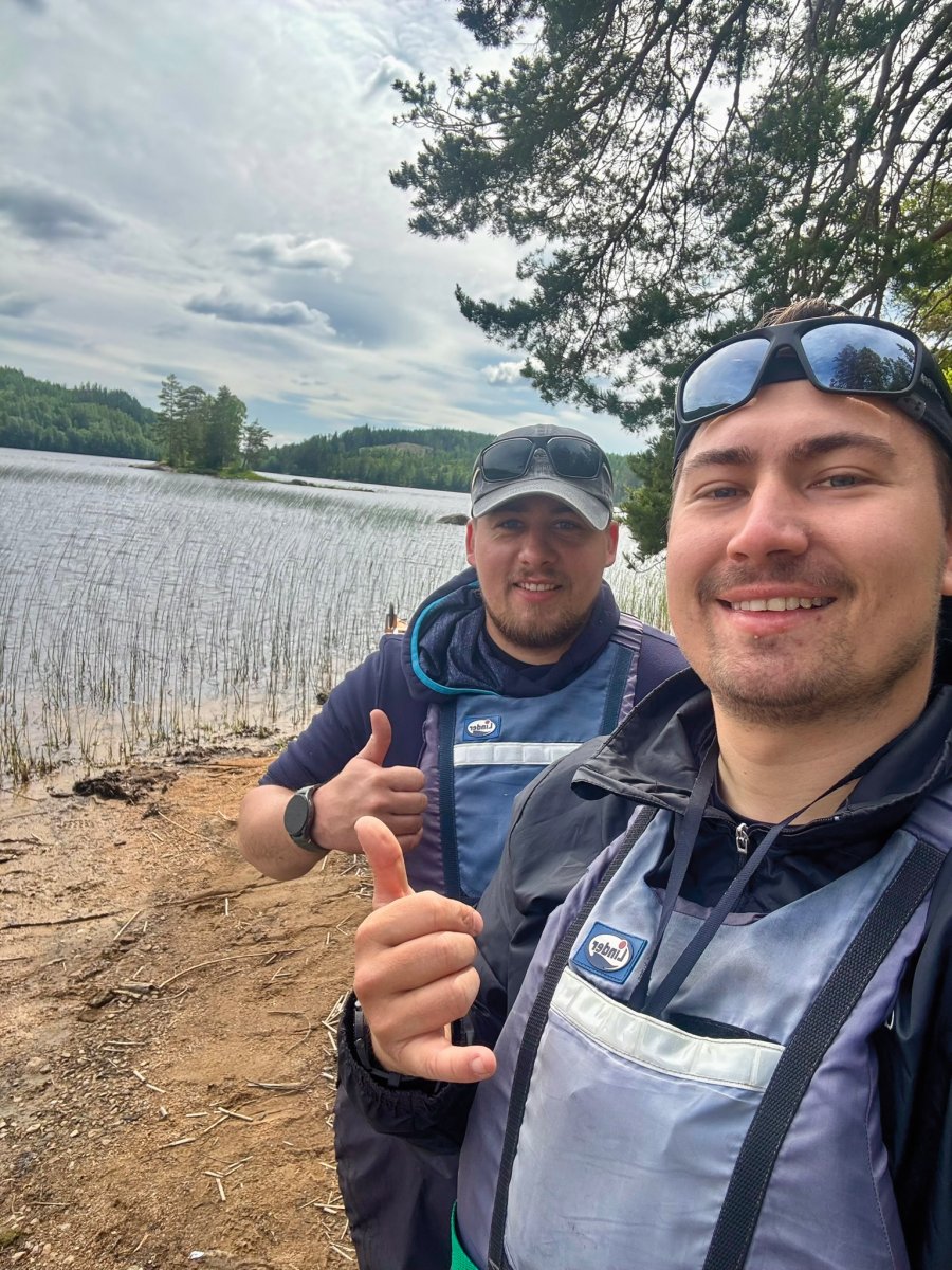 Die ersten Tage waren geprägt vom Einfinden. Wir mussten lernen, wie wir das Kajak beladen, wie wir das Lager aufbauen, wie wir den Alltag draußen organisieren. Am Anfang war das Kajakfahren noch ungewohnt, vom Boot aus zu angeln haben wir uns erst nicht getraut. Das änderte sich mit der Zeit. Das Angeln war für mich eine neue Erfahrung. Wir hatten uns den schwedischen Angelschein besorgt. Ich fand es erstaunlich entspannend. Ich habe die Angel ausgeworfen und die Fische herangezogen, David hat den Rest übernommen. Gefangen haben wir Barsche und Hechte. Der größte Hecht war etwa siebzig Zentimeter lang, der größte Barsch war bei etwa 35 cm. Über dem Lagerfeuer zubereitet schmeckten sie besonders gut.