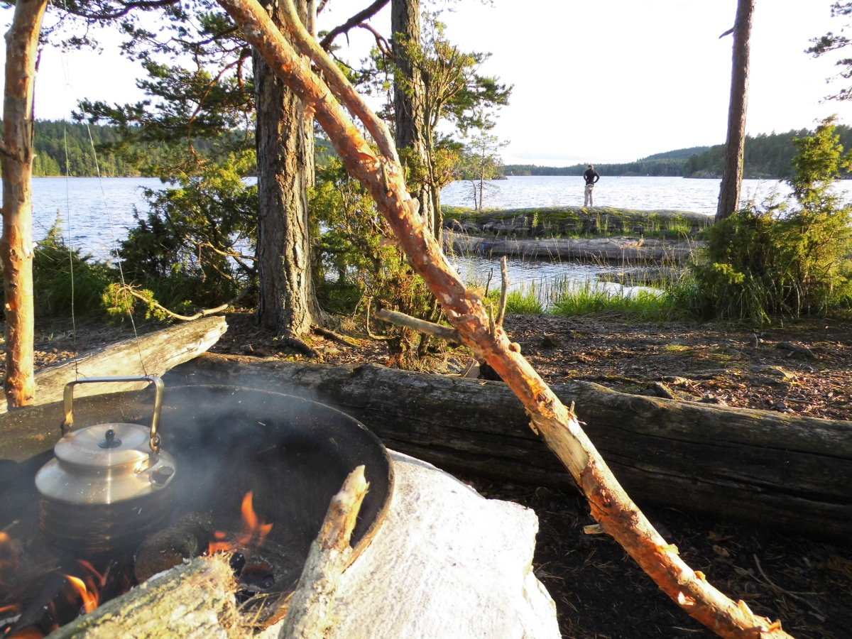 Nach den ersten Schauern hatten wir den Rest der Woche wunderbaren Sonnenschein. Ob Angeln, Kochen, Schnitzen oder kleine Ausflüge in die Umgebung – bei diesem Wetter machte einfach alles Spaß. Wir haben sogar selbst eine Angel aus Stock und Draht gebaut. Gefangen haben wir zwar nichts, aber lustig war es allemal. Einmal waren wir wandern in Lennartsfors, dem kleinen Dorf in der Nähe des Basiscamps. Der Weg dorthin verlief sehr idyllisch durch einen Wald mit einem kleinem Bach und Unmengen an Pilzen. Das Dorf selbst war klein und verschlafen, das einzige Café hatte geschlossen. Aber dafür hatten wir ja genug Proviant dabei. Belohnung für die Strecke war dann selbstgebackene Outdoor-Pizza! Die zu backen funktionierte wirklich besser als erwartet. Einziger Tipp fürs nächste Mal: Alufolie dicht verschließen, damit keine Asche hineingelangt! Eine andere Tour brachte uns im Kanu an die norwegische Grenze. Die war von unserer Insel aus gut erreichbar und bei dem Traumwetter ein schönes Ziel. Am meisten beeindruckt hat uns allerdings nicht der Grenzstein, sondern die atemberaubende Stille auf dem Rückweg. Als einmal ein Rabe an uns vorbeiflog, konnte man die Flügelschläge und seine Rufe über den ganzen See hinweg hören. So schön die Zeit auf der Insel war, so schnell verging sie auch. Den letzten Tag gingen wir ganz entspannt an, genossen mit ein bisschen Wehmut noch ein letztes Mal die Aussicht und die Natur um uns herum und dann ging es auch schon bald zurück ins Camp. Das war dank eines plötzlichen Sturms ganz schön mühselig, aber schließlich hatten wir es doch geschafft und kamen müde und glücklich an. Nach der Abgabe der Ausrüstung und einer kleinen Stärkung sowie der ersten warmen Dusche seit einer Woche stiegen wir abends in den Bus und wurden sicher und mit vielen Erinnerungen im Gepäck zurück nach Deutschland gebracht. Danke Scandtrack, für diese unvergessliche Zeit! Wir kommen auf jeden Fall wieder!