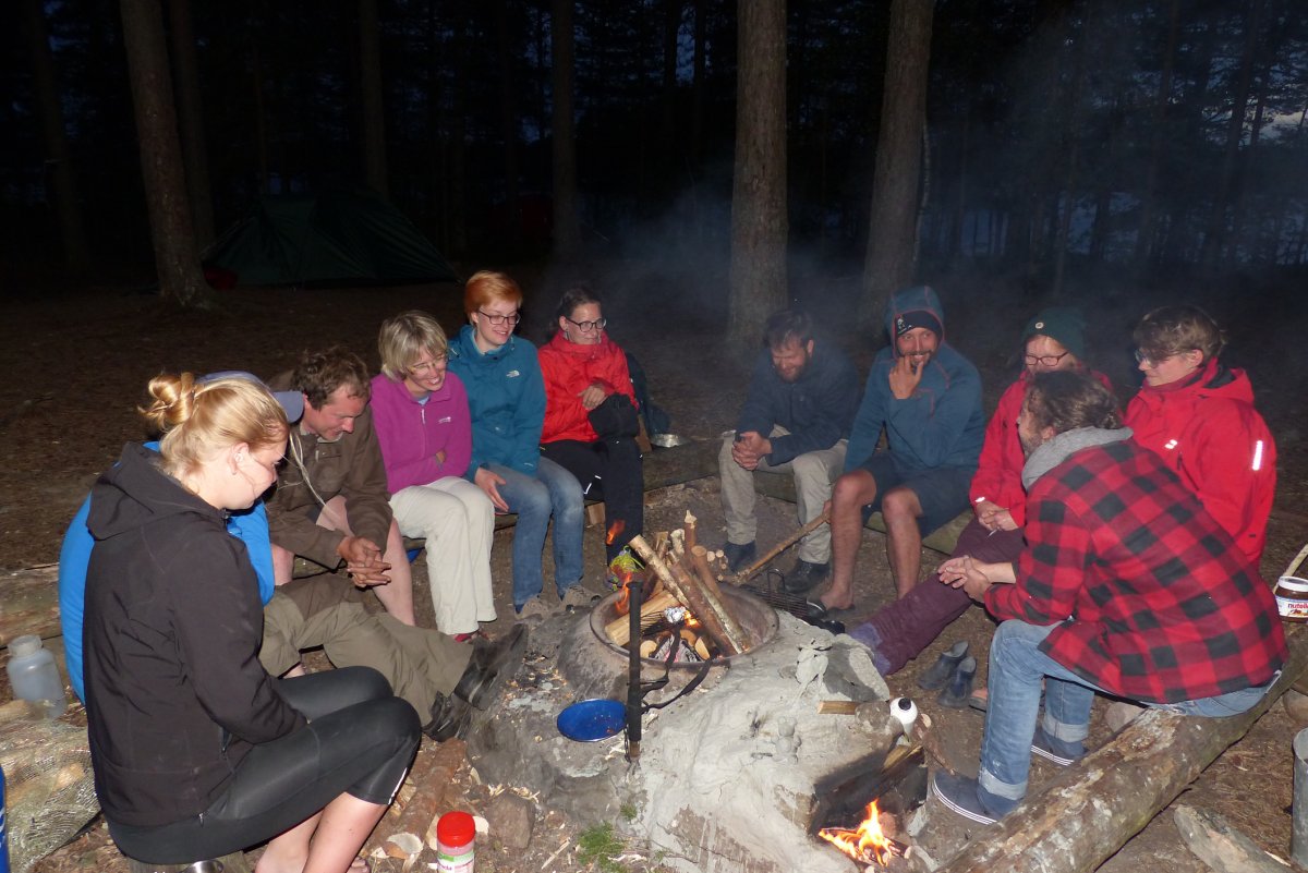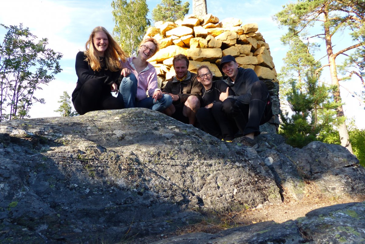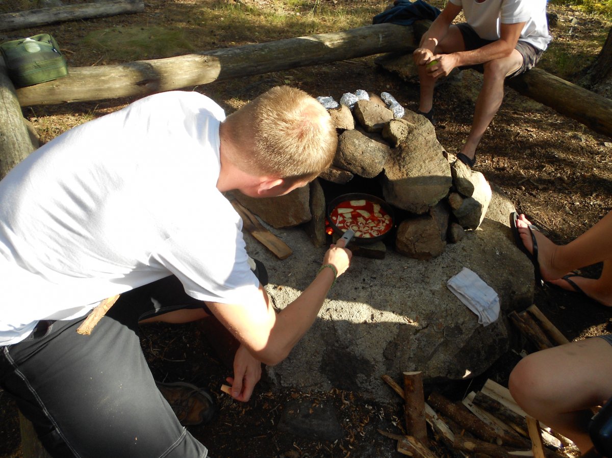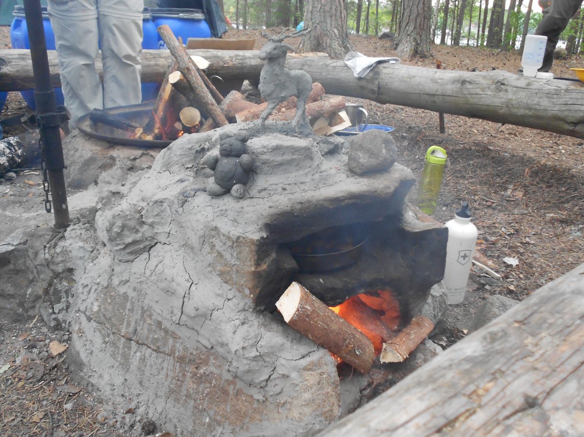 Und auch kulinarisch haben wir einige Höhepunkte gehabt. Auf einer Insel haben wir mit großen Steinen über eine Feuerstelle einen Steinofen gebaut und haben ihn gleich genutzt für einen PizzaAbend. Die Teigproduktion wurde gleich gestartet und jeder hat sich seine Lieblingspizza gebaut, als Dessert sogar mit Nutella bestrichen. Neben Milchreis (mit selbstgeschnitztem Löffel der Gruppe) mit Erdbeersoße, Bratkartoffeln, Mischgemüse und selbstgeangeltem Fisch, war der selbstgebackene Schokokuchen die Krönung. Der zweite Ofen wurde nicht nur aus Steinen gebaut, sondern auch noch mit Lehm verkleidet und mit Rentier und Teddybär verschönert. Die Holztür musste zwischendurch mal abgekühlt werden, da sie leicht Feuer fing, aber das brachte uns nicht davon ab einen Kuchenteig anzurühren und zu backen. Trotz leicht rauchigem Aroma schmeckte der Kuchen richtig klasse.