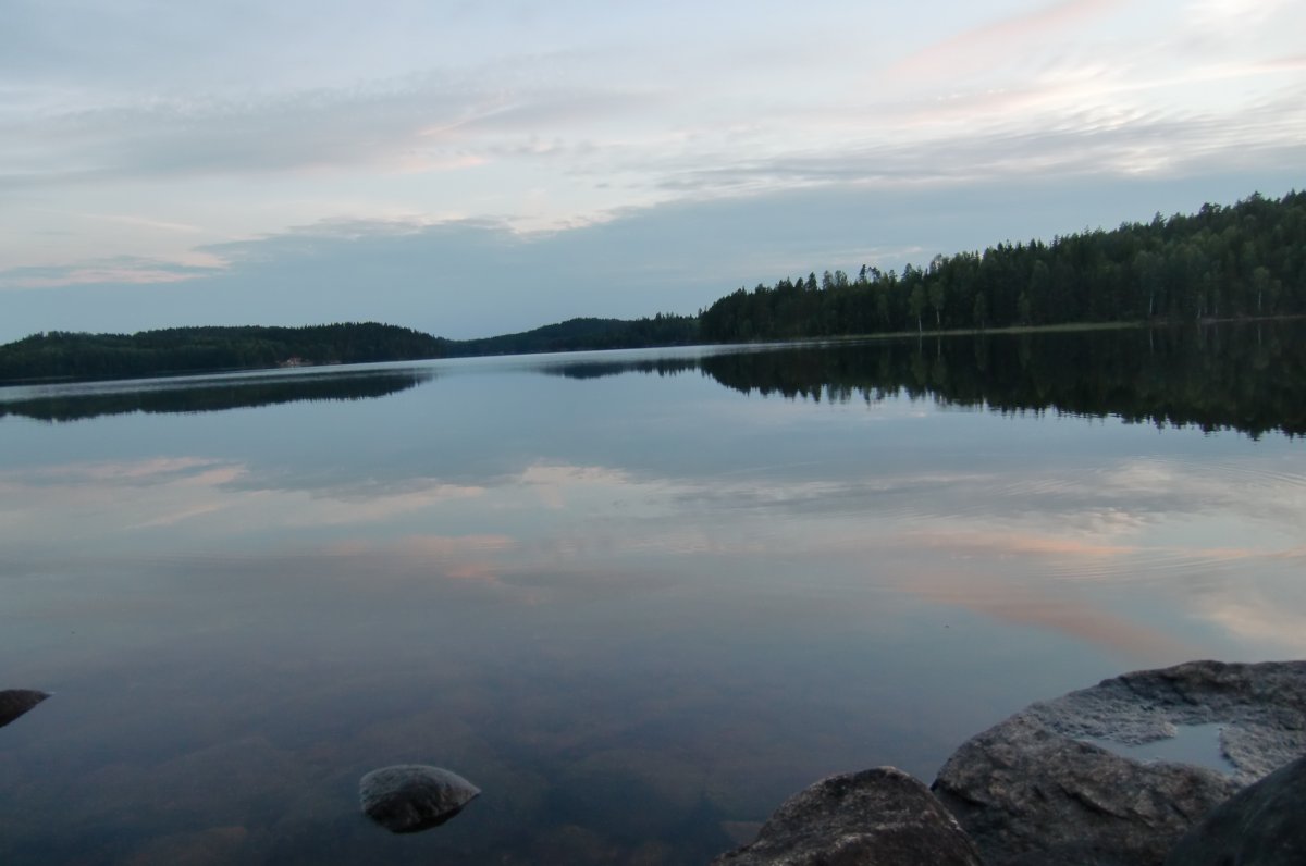 Die erste Paddeletappe am nächsten Morgen war nur sehr kurz. Nach weniger als einer Stunde mussten wir unser Kanu auf den Kanuwagen laden und über Land weiterziehen. Auch wenn die Wanderung etwas anstrengend war, konnten wir doch die sehr schöne Landschaft genießen, durch die leichter Kamilleduft wehte. Am nächsten See angekommen, ließen wir das Kanu ins Wasser und gingen bei herrlichem Sonnenschein erstmal ausgiebig schwimmen. Auf dem Övre Blomsjön sind wir anschließend keinen anderen Kanus begegnet, ebenso waren heute (Montag) auch keine Motorboote mehr unterwegs. In Ed mussten wir unser Kanu dann zum zweiten Mal umtragen, vorbei an einer ehemaligen Wassermühle und einem Steinbruch. Auf dem Nedre Blomsjön paddelten wir noch bis Rastplatz 32. Nachdem wir dort unser Nachtlager aufgeschlagen und zu Abend gegessen hatten, bewunderten wir den See, dessen Oberfläche von Minute zu Minute glatter wurde, bis schließlich überhaupt keine Bewegung mehr auszumachen war.