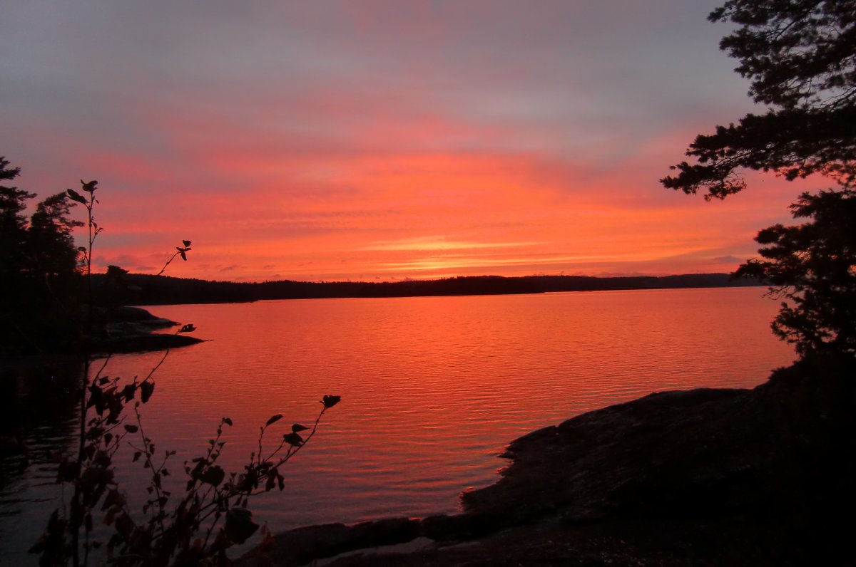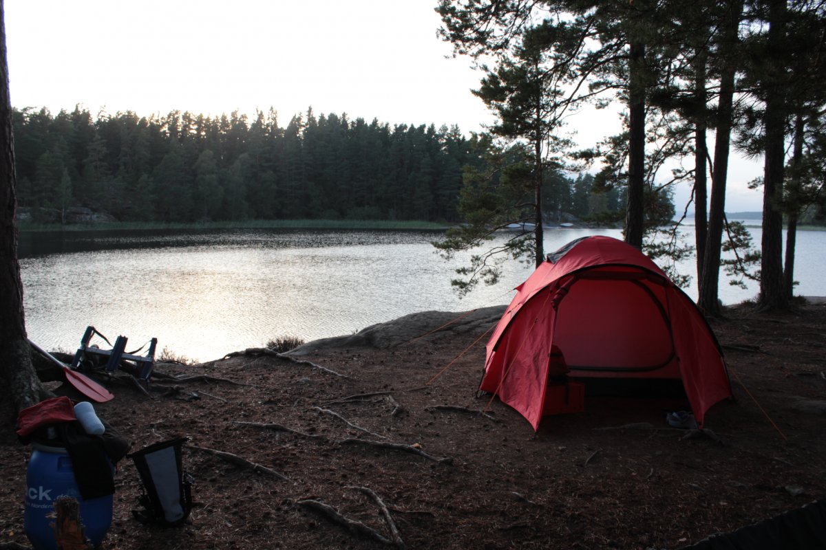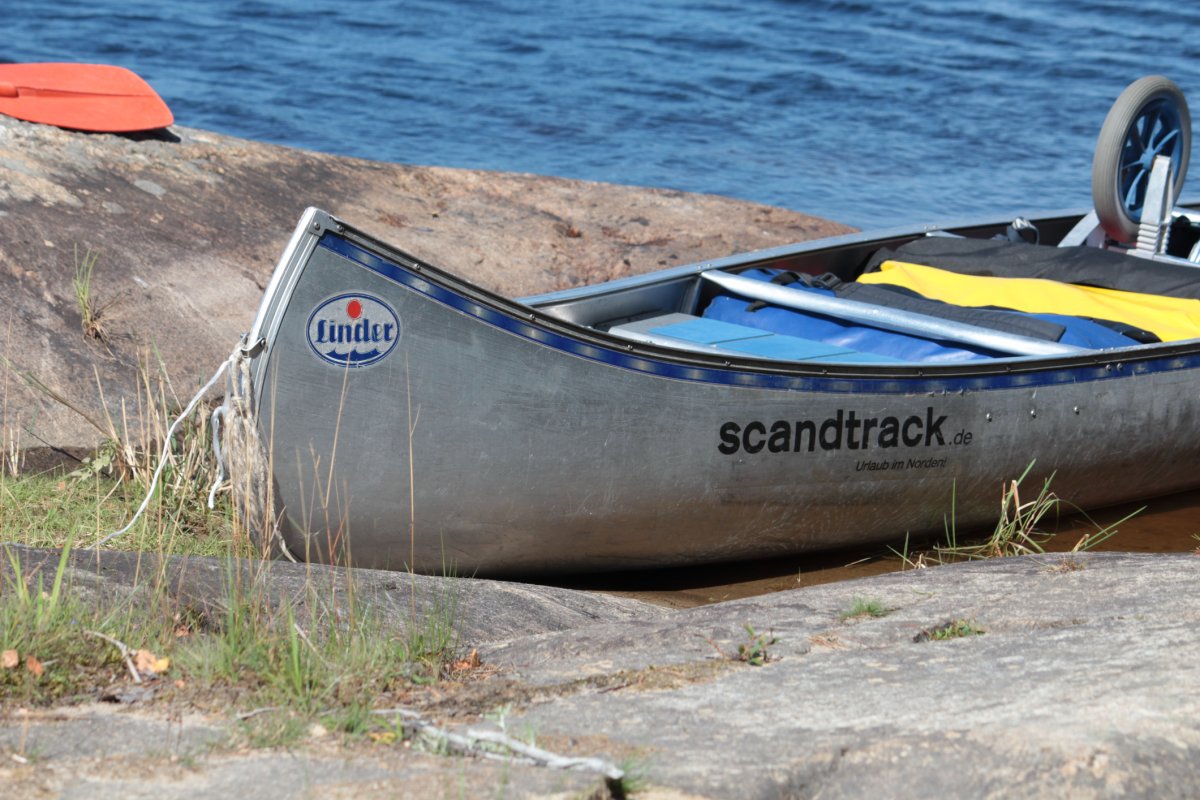 Über Nacht sind wir mit dem umweltfreundlichen Reisebus von Hamburg nach Lennartsfors gefahren. Im Camp angekommen, bekamen wir zuerst einen kleinen Imbiss, um anschließend unsere umfangreiche Ausrüstung in Empfang zu nehmen. Nachdem wir alles im Kanu verstaut hatten ging es auch schon aufs Wasser und geradewegs hinein ins Abenteuer. Geradewegs bedeutet in unserem Fall allerdings: im Zickzack-Kurs! Keiner von uns ist vorher wirklich Kanu gefahren, was das Kurs halten am Anfang unmöglich machte. Kaum waren wir 45 Minuten gefahren, da zwang uns das Wetter bereits wieder zum Anlegen. Starken Regen und ein aufziehendes Gewitter wollten wir uns lieber nicht vom Wasser aus angucken. Wir spannten also unser Tarp auf und warteten den Regen ab, der zum Glück genauso schnell abzog wie er gekommen war. Nach dieser bestandenen Feuertaufe setzten wir unsere Reise fort und legten bis zum Nachmittag noch einige Kilometer zurück. Wir waren überrascht, wie schnell wir doch vorankamen. Die erste Nacht wollten wir an einem der angelegten Rastplätze verbringen. So steuerten wir Rastplatz 15 an und schlugen dort unser Lager auf. Als nächstes stand eine ausführliche Sichtung unseres Proviants auf dem Programm, also räumten wir unsere Lebensmitteltonne aus und breiteten alles auf einer Picknickdecke aus. Scandtrack hatte für ein wirklich umfangreiches Verpflegungspaket gesorgt. Am Abend tauften wir unser Kanu auf den Namen Lindolf und erfrischten uns noch im glasklaren See. Auf einem Felsen am Wasser sitzend beobachteten wir den Sonnenuntergang und ließen den Tag ausklingen.