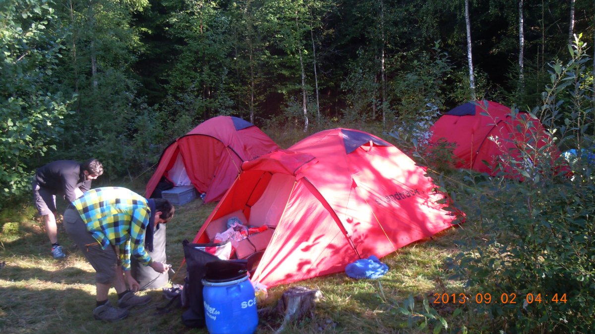 Wir hatten schon die Tage vorher eine Liste gemacht und alles was nur irgendwie mit auf die Tour kommen könnte in einer Kiste gesammelt um auch wirklich nichts zu vergessen. Eine ganze Woche war schließlich das längste was wir beide bisher komplett Outdoor zu leben gedachten. Da musste die Ausrüstung perfekt sein. Am Vormittag packten wir dann die Rucksäcke und die letzten Vorbereitungen wurden getroffen, Proviant für die Fahrt war in Massen vorhanden und eigentlich war alles bereit. Abends gegen 22 Uhr wurden wir von Tajo’s lieben Eltern nach Puttgarden gebracht von wo aus wir den Bus von scandtrack bestiegen, welcher uns dann nach Lennartsfort brachte. Die Fahrt mit dem Bus war entspannt und ich für meinen Teil konnte recht angenehm auf Tajo’s Schoß schlafen. Die Busfahrer erlaubten nur kurze Pausen, aber schließlich wollten auch alle schnell ankommen, die Kanus in Empfang nehmen und loslegen. So war es dann auch. Gegen mittag, nach einem kurzen Snack schleppten wir unsere Rucksäcke zum Basiscamp nahe der Einstiegsstelle. Dort haben wir dann endlich unsere Ausrüstung erhalten, auf die wir vorher schon ziemlich gespannt waren. In der Kiste und der großen Futtertonne war wirklich alles Erdenkliche drin, was man für ein Überleben in der Wildnis nur brauchen kann. Nachdem wir dann alles nach und nach in den wasserdichten Packsäcken verstaut hatten, mussten wir nun noch alles mit einem kleinen Fußmarsch direkt zur Einstiegstelle bringen. Dort haben wir dann eine kurze Einweisung erhalten. Das wichtigste, was Tajo wohl nie wieder vergessen wird, sind der C und der J-Schlag. Damit ist es hauptsächlich dem hinteren Fahrer möglich das Kanu zu steuern. Diese Steuerschläge können jedoch je nach Wind- und Wetterlage recht anstrengend sein ;)