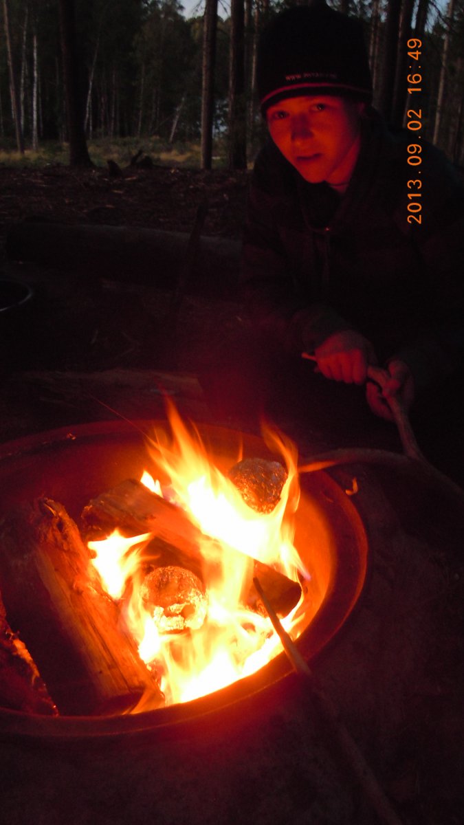Nach diesem ganzen Backen (nebenbei haben wir natürlich noch Holz gesägt und gehackt, zwei Feuer am Laufen gehalten und Abendessen gekocht…) waren wir ziemlich erschöpft. Wir saßen nur noch am Feuer und haben Apfelkuchen gegessen, und die Sterne angeschaut und entspannt. Bevor wir dann am Feuer eingeschlafen sind, sind wir schnell ins Zelt gegangen und haben dort weitergeschlafen.