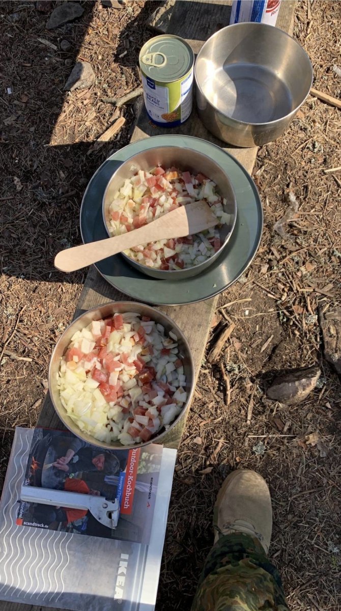Dort angekommen richteten wir unser Lager ein. Dies bedeutete Feuerholz suchen, sägen und spalten. Schlafgelegenheiten einrichten, Angeln aufbauen etc. Danach wurde erstmal die Essenstonne ausgeräumt um zu schauen was wir so alles Tolles haben. Lasst euch eins sagen: Es ist reichlich und definitiv ausreichend was alles in der Essentonne vorhanden ist. Auch ist für jeden Geschmack etwas dabei und mit dem Outdoor-Kochbuch, welches extra auf Zutaten aus der Tonne abgestimmt ist, sind auch genug Rezeptideen vorhanden, welche jeder (wirklich jeder) nachkochen kann. So gab es bei uns am ersten Abend die Terence Hill Pfanne.