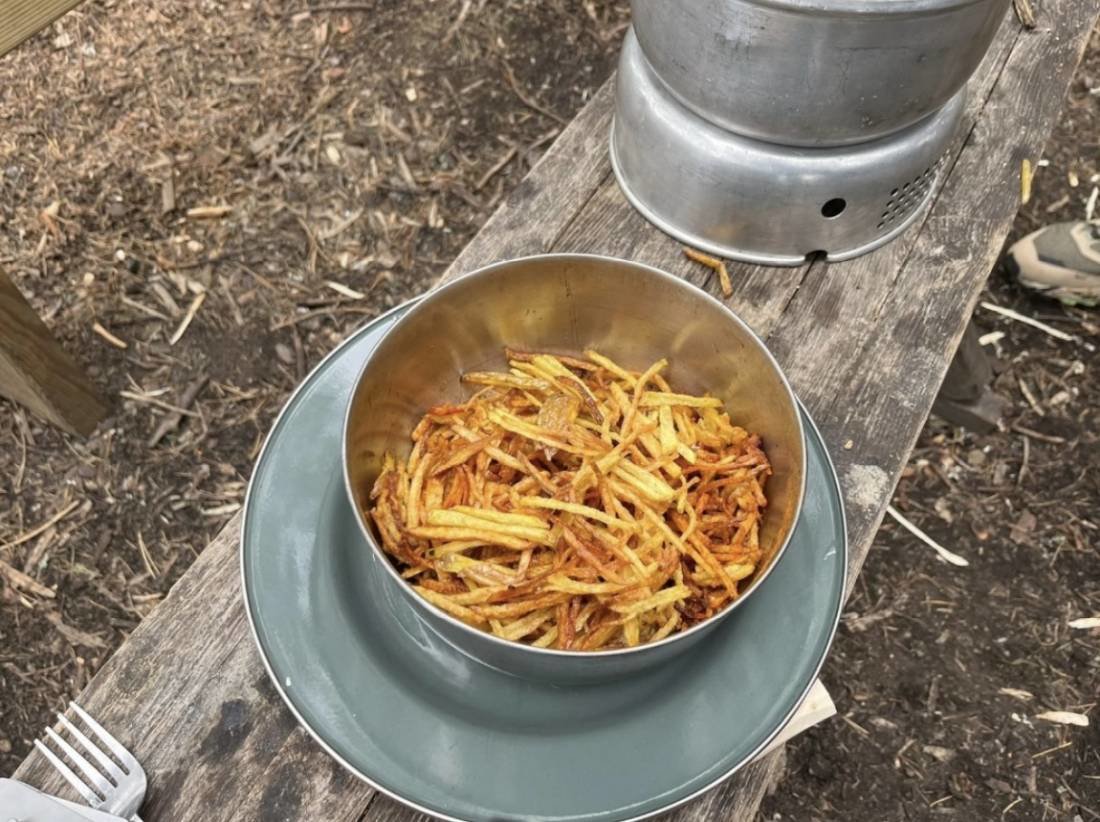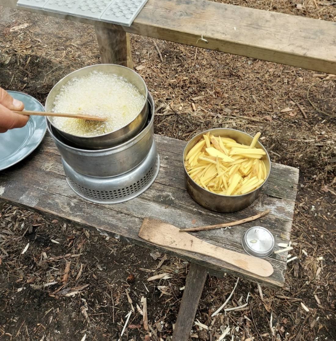 ⇨ Beim Essen kann man auch sehr kreativ sein, hier sind keine Grenzen gesetzt. Selbst Pommes Frittieren in der Wildnis ist möglich. (Natürlich haben wir Sicherheitsvorkehrungen, mit einem Eimer Sand und einem Handtuch zum eventuellem Löschen getroffen. Auch das Öl wurde von und im Nachgang wieder in ein leeres Marmeladenglas gefüllt und im Müllsack entsorgt)