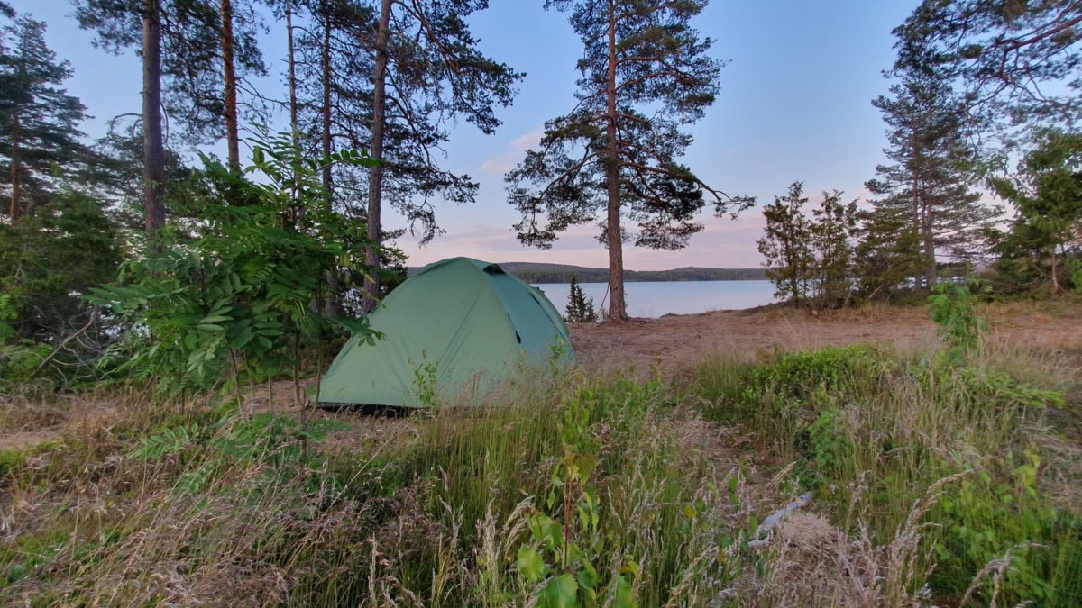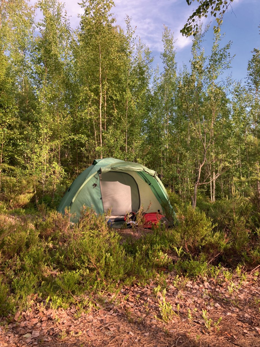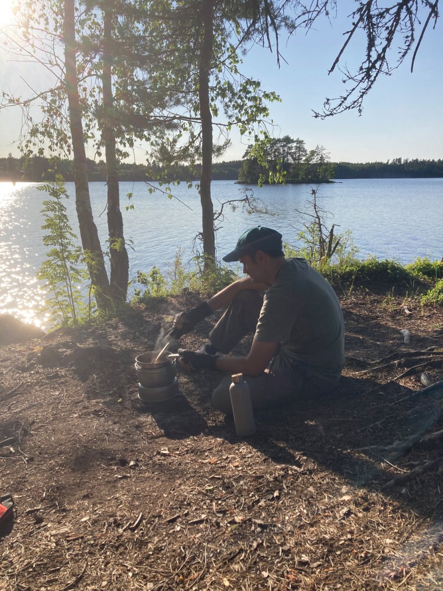 Nach dem Frühstück packen wir unsere Sachen in die Kajaks. Kurz bevor wir losfahren wollen, fällt Daniel sein Handy aus der Tasche und runter auf die Steine. Danach sieht der Bildschirm zersplittert aus aber zum Glück war nur die Schutzfolie beschädigt. Heute durchfahren wir eine Gegend mit vielen kleinen Einbuchtungen. Wir paddeln langsam am Ufer entlang und bewundern die Natur und Wälder. Als wir eine kleine Vogelinsel entlangfahren, kreist ein Vogel mehrfach schreiend über uns und insbesondere über Daniel. Er scheint nicht besonders erfreut über unsere Anwesenheit zu sein und Daniel wird nur knapp verfehlt als der Vogel seinen Toilettengang über Daniels Kajak erledigt. Am späten Nachmittag errichten wir unser Lager auf einer Insel mit einem schönen Wald und vielen Birken. Wir entspannen in der Hängematte und als wir abends im Zelt zu Bett gehen, höre ich einige Mäuse piepen und direkt am Zelt vorbeirennen, so niedlich! Leider gibt es auf dieser Insel jedoch auch recht viele Spinnen…