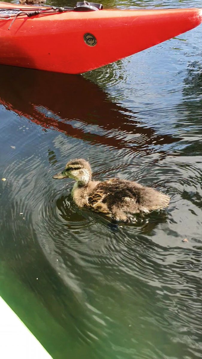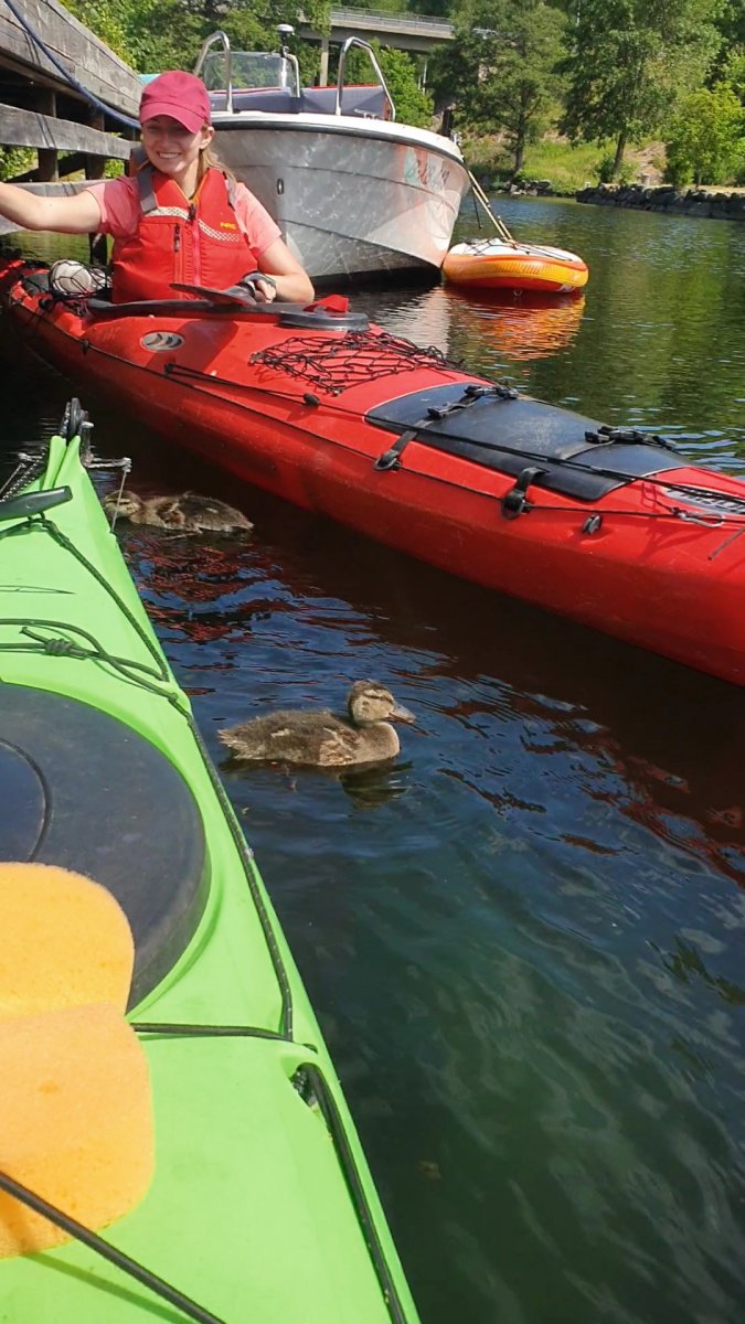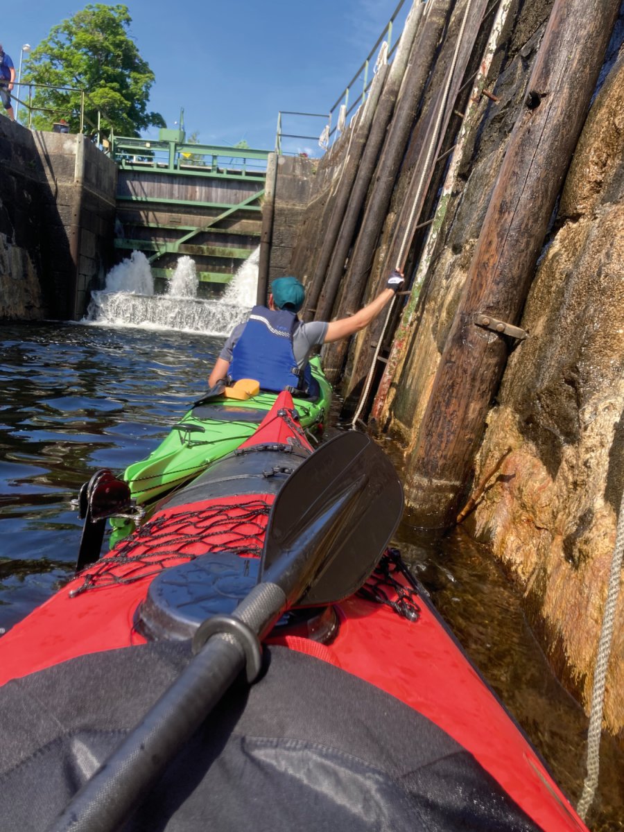 Am Morgen hält ein Boot mit zwei Männern aus der Gegend an unserem Camp. Sie kontrollieren die Dano Plätze, sammeln Müll ein und schauen, dass das momentane Feuerverbot eingehalten wird. Danach nehmen wir ein kurzes Bad im See. Das kalte Wasser weckt uns dann auch komplett auf… Nach dem Frühstück paddeln wir los. Wir möchten die Schleuse in Gustavsfors passieren, welche bis 16 Uhr geöffnet ist, daher müssen wir uns beeilen. Daniel paddelt das letzte Stück voraus und erreicht gerade noch rechtzeitig um Punkt 16 Uhr die Schleuse. Der nette Herr an der Schleuse wartet zum Glück auch noch kurz bis ich ein paar Minuten später die Schleuse erreiche. Wir fahren ein, halten uns an einem Seil fest und das Wasser von der anderen Seite strömt ein. Etwas unheimlich, aber auch aufregend. Danach durchqueren wir entspannt eine engere flussartige Gegend. Eine Entenfamilie kreuzt unseren Weg, ich stoppe mein Kajak damit das Entenbaby nicht mit meiner Kajakspitze zusammenstößt. Neugierig quakend zieht die Entenfamilie an uns vorbei. Schöne, lange und dichte Bäume ragen am Ufer herauf. Heute schlagen wir unser Lager wieder auf einer Insel auf. Mit uns sind noch zwei andere 2er Gruppen auf der Insel, jedoch gut verteilt, so dass jede Gruppe ihre Privatsphäre hat. Erschöpft von dem vielen Paddeln errichten wir unser Lager. Zum Abendessen gibt es Nudeln mit Pesto. Im Zelt spielen wir eine Runde „Hive“, eine Art Steinchen-Spiel, bei dem ich endlich das Erste Mal gewinne! Danach legen wir uns im Zelt zum Schlafen. Auf der Insel sind viele Vögel, die laute Geräusche in der Nacht von sich geben. Ich wache alle paar Stunden auf und um 09:30 Uhr stehe ich schließlich auf.