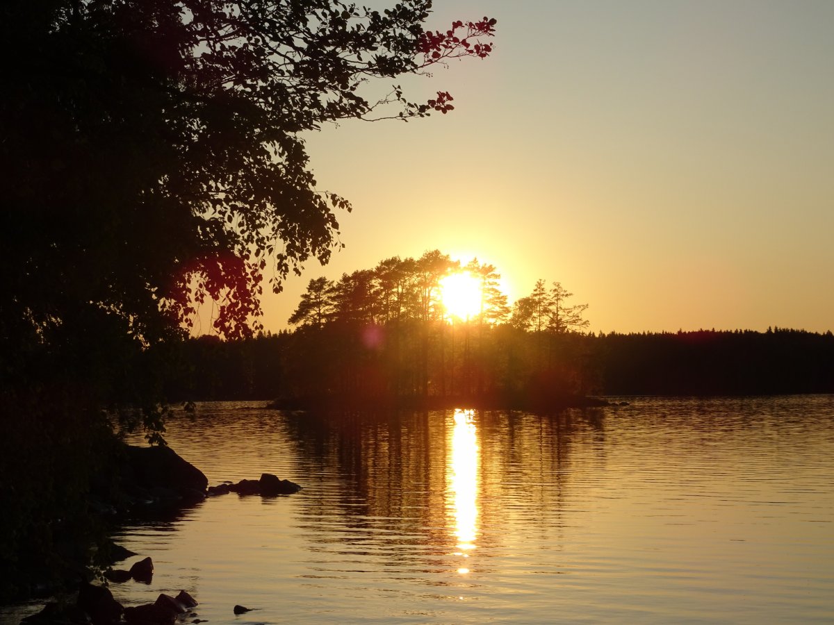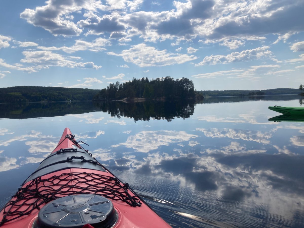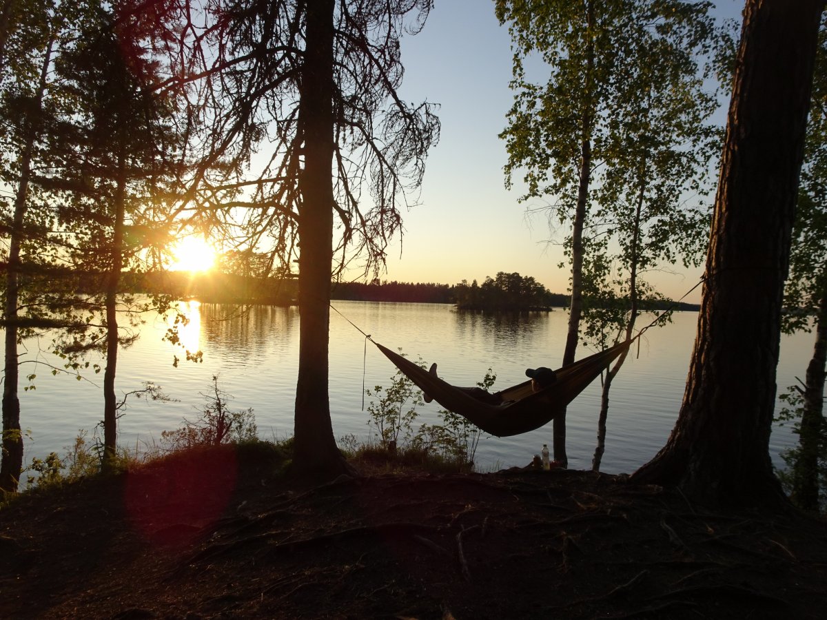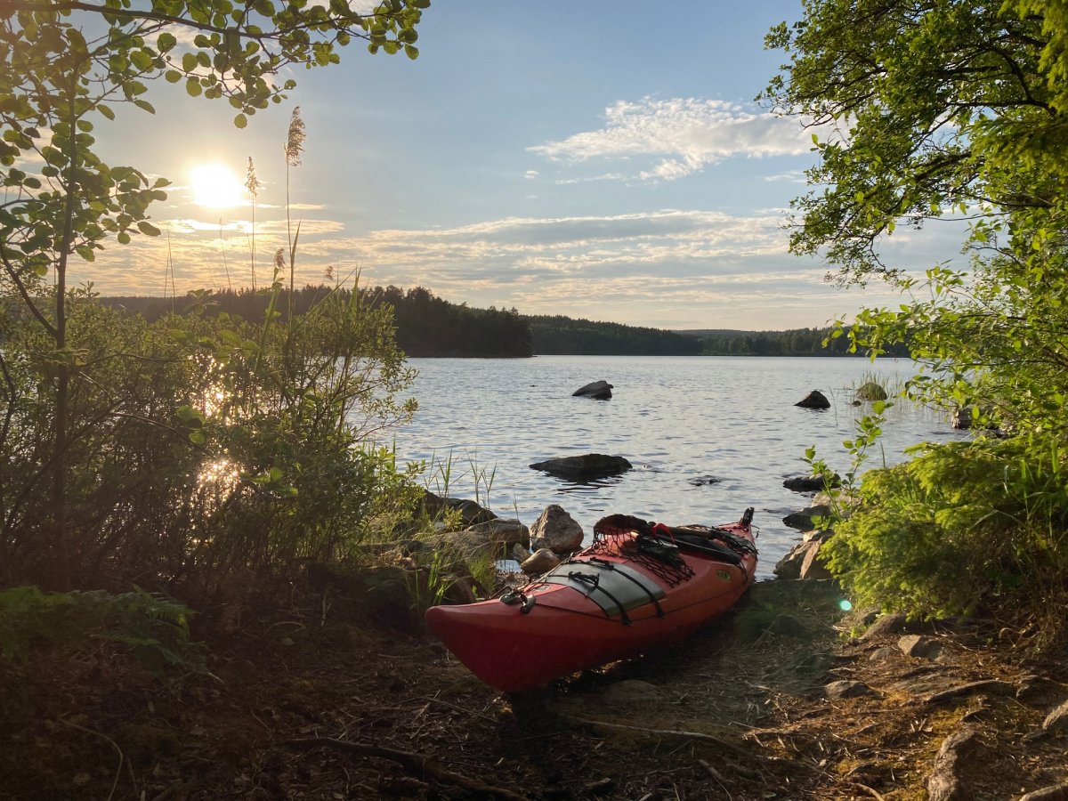 Nach einer langen Busreise sind wir endlich in Bengtsfors angekommen. Nach einem Kaffee, Gepäck umpacken und einer Kajak-Einweisung geht es schon los. Wir paddeln zum Zentrum von Bengtsfors, heben etwas Bargeld ab und gehen Proviant für die nächsten Tage einkaufen. Unterwegs fällt uns auf, dass Daniel seine Uhr verloren hat. Allerdings lässt sich diese später auf seinem Kajaksitz wiederfinden. Wir paddeln etwas weiter und schlagen unser Camp auf einer Insel auf. Während wir unser Camp vorbereiten, kommt uns eine Ente besuchen, die uns munter schnatternd etwas Gesellschaft leistet und neugierig durch die Gegend läuft. Zum Abendessen gibt es Bratkartoffeln mit Speck und Brot, sehr lecker! Und für mich gibt es noch ein schwedisches Bier. Abends entspannen wir in der Hängematte und spielen später eine Runde „Welcome to the Moon“ (durch das Kombinieren von Zahlen versucht man seine Mission durchs Weltall zu bewältigen). Gegen 22:30 Uhr wird es etwas dunkler und wenig später schlafen wir erschöpft und eingekuschelt in unseren Schlafsäcken ein.