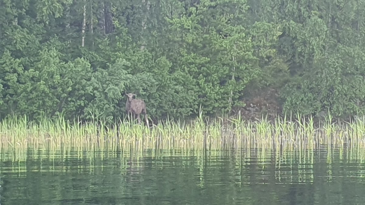 Die Sonne strahlt heute besonders stark vom Himmel und ich fülle meine Cappy mit kaltem Seewasser, um mich etwas abzukühlen. Heute weht kaum Wind und das Wasser ist spiegelglatt. Die kleinen Inseln auf dem See spiegeln sich nahezu perfekt im Wasser. Wir paddeln langsam an dem kleinen Dorf Torrskog entlang, welches ein paar Häuser und eine Kirche mit einem Friedhof zu haben scheint. Danach wird die Landschaft wieder etwas wilder und rauer. Wir lassen uns langsam im Wasser nahe dem Ufer treiben und überlegen gerade, wo wir am besten unseren heutigen Lagerplatz aufschlagen sollen als ich auf einmal von rechts ein Geräusch höre. Am Ufer im Wasser steht tatsächlich ein Elch! Der Elche frisst gemütlich Blätter von einem saftigen Zweig. Ganz langsam und vorsichtig kommen wir etwas näher. Der Elch schaut uns an und überlegt wohl, ob er weiter essen soll oder nicht. Er isst noch ein paar Minuten weiter und verschwindet dann im Wald. Was für ein wunderschönes Erlebnis! Danach halten wir an einem kleinen Strand und prüfen, ob wir hier unser Lager errichten können. Jedoch befindet sich hier ein Ameisenhaufen und es wimmelt nur so voller kleiner unzähliger Ameisen. Also suchen wir weiter und finden etwas später einen geeigneten Platz, etwas erhöht mit toller Aussicht auf das Wasser.