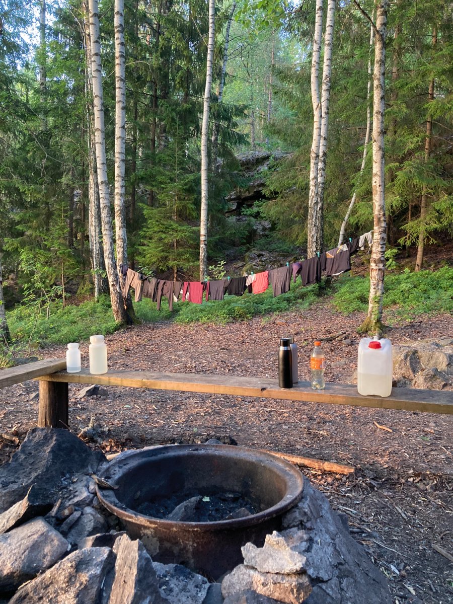 Zum Frühstück gibt es heute Brot mit Nutella. Sehr lecker! Daheim esse ich eher selten Nutella. Gegen Mittag fahren wir los. Heute fahren wir nur ca. 2 Stunden langsam und entspannt mit dem Kajak umher. Wir finden ein schönes, etwas einsam gelegenes Dano an Land im Wald. Es gibt ein paar provisorische Sitzbänke und jemand hat sogar eine gemütliche Rückenlehne mit Ästen gebaut, was für ein Luxus endlich mal wieder gemütlich auf einer Bank zu sitzen! Dies macht das Sitzen nochmal deutlich gemütlicher. Vom Sitzen und Kochen mit unserem kleinen Kocher auf dem Boden tut uns schon langsam der Rücken weh. Wir waschen unsere Kleidung am Ufer und gehen auch selbst etwas zum Auffrischen ins Wasser. Auf der Holzwand im Dano hat jemand einen Hinweis hinterlassen, dass es hier im Wald eine verlassene Scheue geben soll. Wir machen uns also auf den Weg durch den Wald. Der Wanderweg bzw. Trampelpfad hört nach einiger Zeit auf und wir laufen quer durch den Wald. Der Weg ist recht uneben und voller Äste aber nach einiger Zeit finden wir tatsächlich die verlassene Scheune. Sie sieht sehr alt und beschädig aus. Im Inneren stehen einige alte Geräte und sogar Kutschen-ähnliche Fahrzeuge. Es lassen sich kleine Ställe und altes Heu durch die Fenster erblicken. Alles wirkt sehr alt und unheimlich. Der perfekte Drehort für einen neuen Horrorfilm würde ich sagen! Freudig über unsere Entdeckung machen wir uns später auf den Weg zurück (zwischenzeitlich blickt ein Reh recht überrascht über unsere Anwesenheit aus dem Wald hervor und läuft anschließend davon). Am Abend sitzen wir auf einem großen Felsen und genießen die verbleibende Sonne und wunderschöne Aussicht über die Seelandschaft.