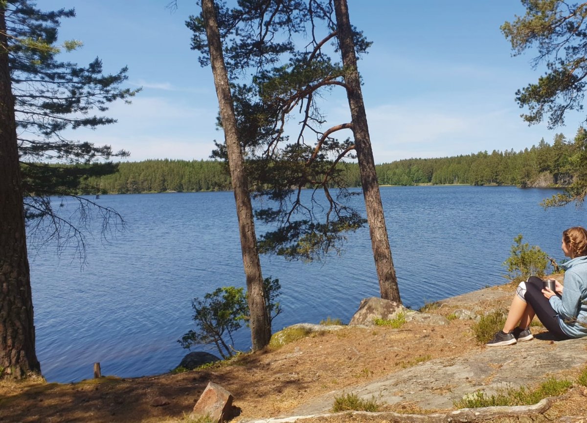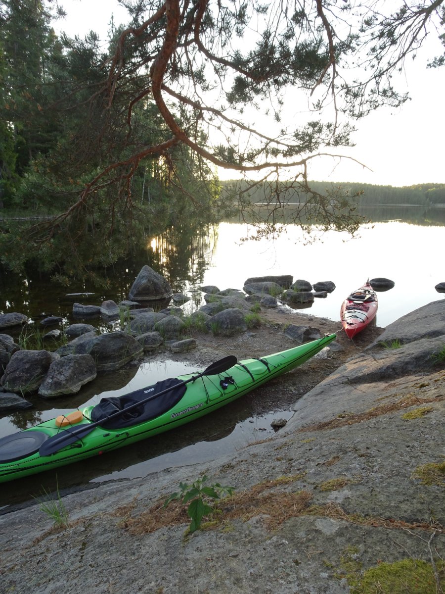 Nach einem späten Frühstück, Kaffee und Instant-Nudeln, packen wir unsere Sachen zusammen und fahren mit den Kajaks weiter. Heute möchten wir eine etwas längere Strecke schaffen. Das Wasser ist wunderschön blau und die Sonnenstrahlen glitzern auf dem Wasser. Nach 2 Stunden machen wir eine Pause an Land und essen Brot und Käse-Chips. Danach geht es weiter. Das Paddeln macht Spaß aber ist auch anstrengend. Nach weiteren 1,5 Stunden schlagen wir unser Lager an einem Dano Lagerplatz nähe Gustavsfors auf. Daniel mach Abendessen (Ravioli) und ich kümmere mich um die Schlafsäcke und Isomatten. Nach dem Essen machen wir einen Erkundungsspaziergang durch den Wald (für heute habe ich erstmal genug Wasser gesehen…). Auf einem Felsen genießen wir die schöne Aussicht. Die Sonne steht nun etwas tiefer und die Landschaft spiegelt sich mit unglaublicher Schönheit im Wasser wider.