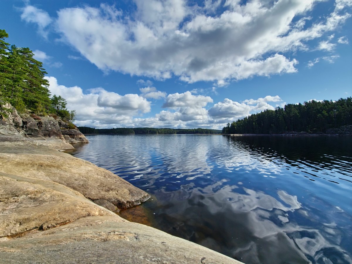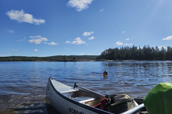 Das Wetter heute war wieder etwas besser und wir konnten uns beim Paddeln wieder etwas Zeit lassen. Angekommen bei DANO-Platz 11 haben wir wie jeden Tag unser Zelt aufgebaut und uns einen gemütlichen geraden Platz am Ufer gesucht. Dort habe ich Gemüsereis und gefüllte Paprikaschoten vorbereitet, während Lina die wenigen Sonnenstrahlen für ein kurzes Bad genutzt hat. Nach dem Essen und Abwaschen, schnappten wir uns das Rätselheft und genossen die Zeit zu zweit in dieser absoluten Traumlandschaft. Nachts konnten wir wieder die Sterne sehen und so saßen wir stundenlang am Ufer. Auf einer gegenüberliegenden Insel hörte eine Gruppe Musik, während sie am Lagerfeuer saßen. Anfangs störte es ein wenig, doch spielten sie nach gewisser Zeit Lieder von einer Band, die wir beide sehr mögen. Während unserer Sternbeobachtung entdeckten wir einige Flusskrebse im Wasser, die schnell flüchteten, wenn der Strahl unserer Stirnlampen sie traf.