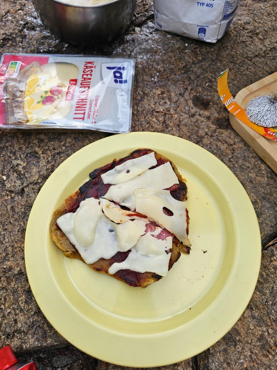 Dadurch, dass die gestrige Nacht durch den Sternenhimmel verkürzt wurde, schliefen wir etwas länger und starteten unsere Tour erst gegen Mittag. Nach den vergangenen windigen Tagen waren wir überrascht, als der See vollkommen ruhig vor uns lag. Keine Welle zu sehen, kein Lüftchen zu spüren. Das hatten wir nicht erwartet, weshalb wir spontan unsere Pläne verwarfen und den Foxen überquerten. Auch hier ließen wir uns zeitweise einfach nur treiben und beeilten uns nicht, bei DANO-Platz 10 anzukommen. Um die letzten Momente mit der Sonne noch auszukosten, sprang ich direkt ins Wasser, jedoch kam dann eine dicke Wolke, die mit ihrer Ankunft die Wärme mitnahm. Bevor wir einen Erkundungsrundgang auf dieser Insel starteten, bereiteten wir Teig für eine Pizza vor. Mit dem Campingkocher setzten wir uns also auf einen annähernd geraden Stein und versuchten, die kleinen Teigstücke durchzubacken. Da immer nur eine Stelle die ganze Wärme abbekommen hatte, war der erste Versuch an einer Stelle komplett verkohlt und drum herum noch halb roh. Der Belag bestand aus Tomatenmark, Salami und Käse, doch konnte dies geschmacklich die verkohlten Stellen nicht ganz verdecken. Bei weiteren Versuchen änderten wir einiges, aber es dauerte sehr lange, bis ein kleines Stückchen fertig war. Wir waren noch nicht ganz satt, mussten aber schon früher abbrechen, weil wir vom Regen überrascht wurden. Schnell packten wir alles zusammen und aßen unsere kleinen, bereits fertigen Pizzastücke im Zelt. Überraschenderweise hatten wir trotzdem einen klaren Nachthimmel und konnten wieder viele schöne Sterne fotografieren und Sternschnuppen entdecken.